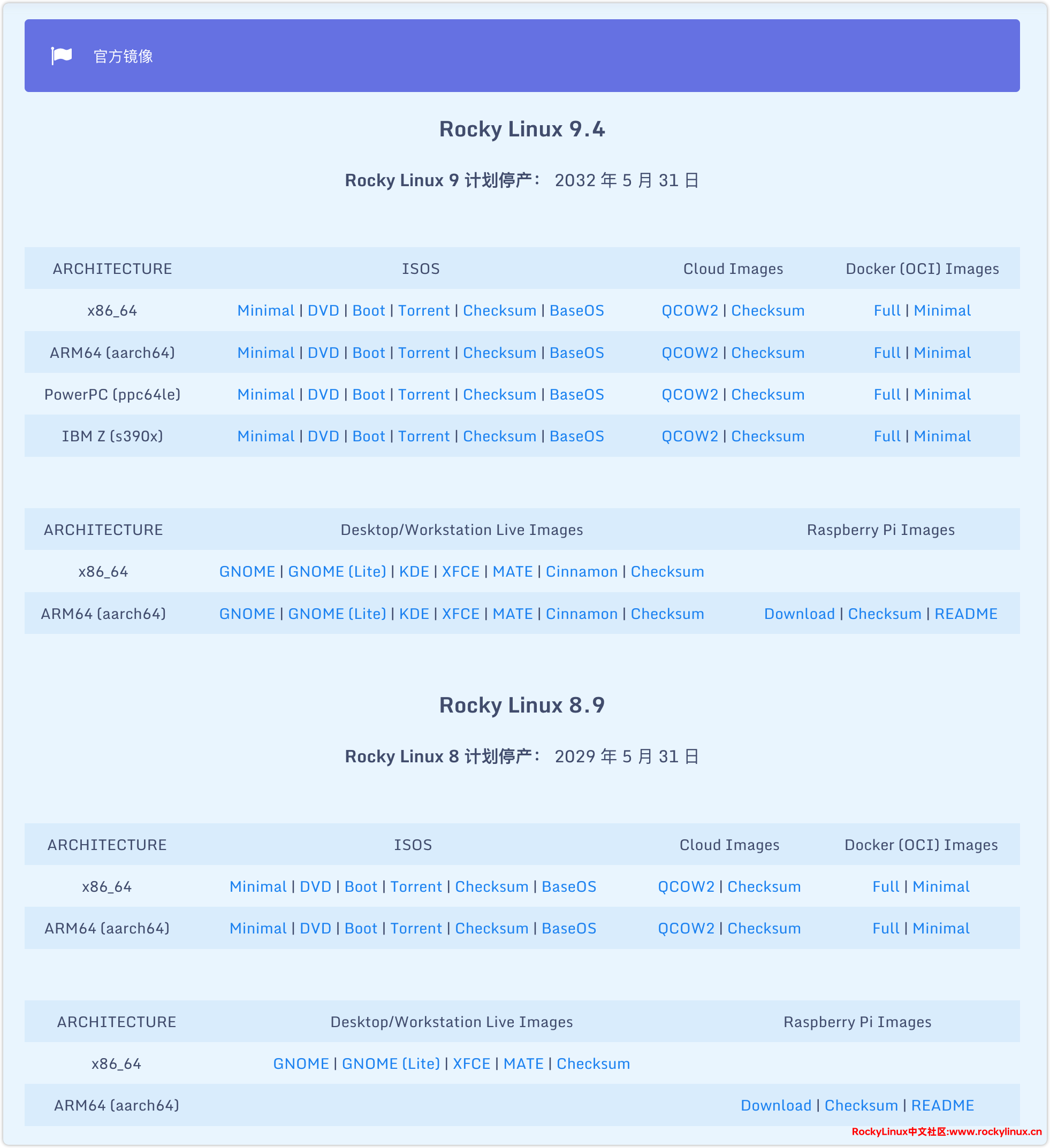 Rocky Linux 中文社区基于区域属性,发布了新的镜像下载链接及国内镜像源,并增加了 Cloud、Docker、Desktop、树莓派等镜像下载链接,详见:下载 – Rocky Linux