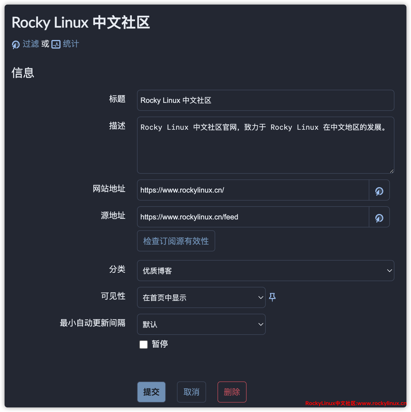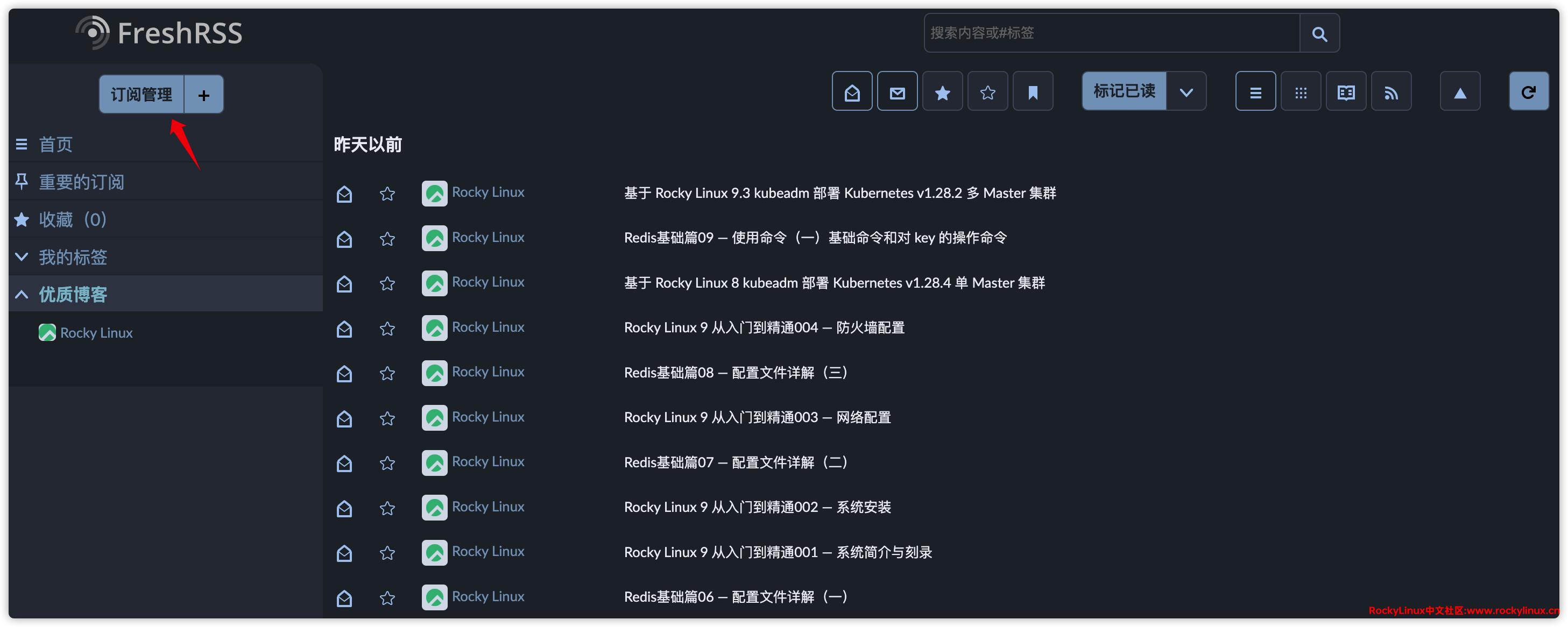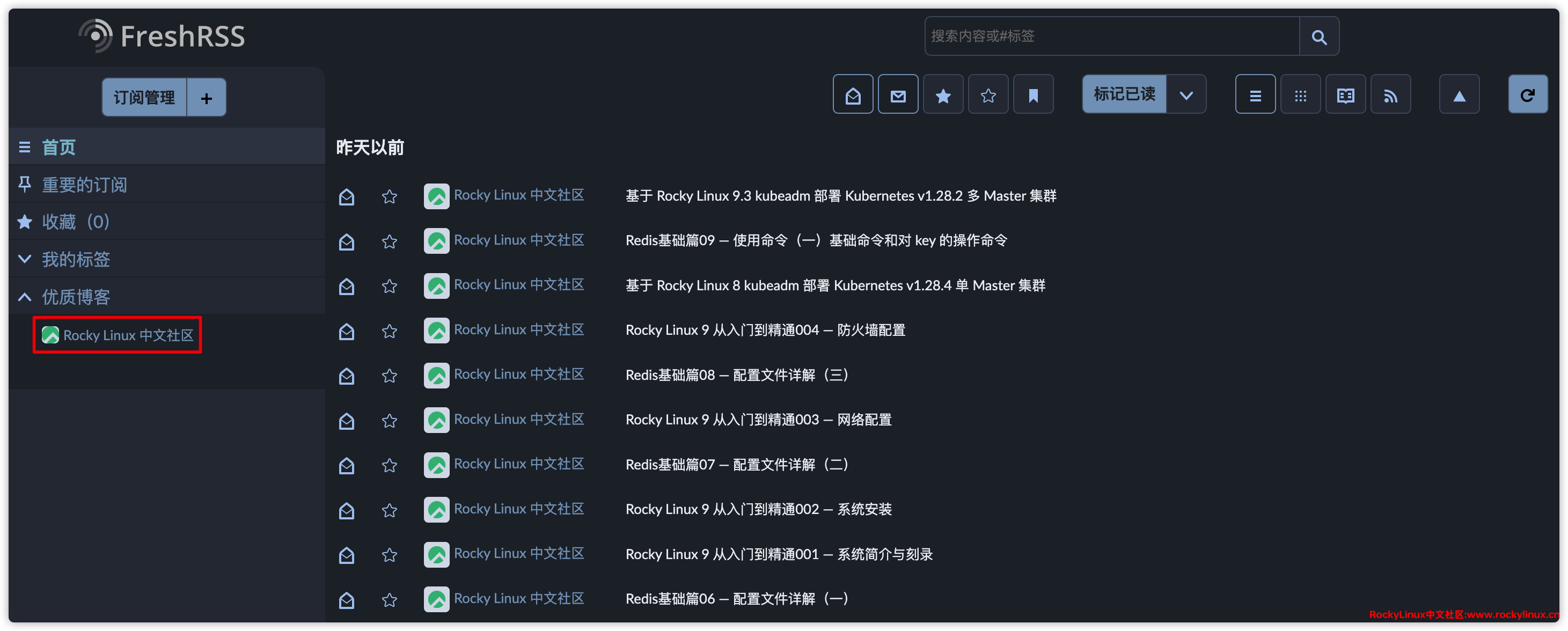 FreshRSS 是一个基于 PHP 语言的自托管 RSS 源聚合器。具备轻量、易于使用、功能强大且可定制等特点。功能十分丰富且强大,支持多用户,且具有匿名阅读模式。同时,支持自定义标签,并提供基于 Google Reader API (推荐)和 Fever API (功能和效率部分受限)的应用程序接口和命令行界面。但 RSS 订阅,需要对应网站开启 RSS 订阅功能,像 Rocky Linux 中文社区就开启了对应订阅: Rocky Linux RSS,如果一些网站没有开启 RSS 订阅,您又想订阅怎么办了?这时候就需要用到另一款软件 RSSHub。RSSHub 是一款开源、易用且可扩展的 RSS 源聚合器,它能从几乎所有内容生成 RSS 源。RSSHub 可以从各种来源聚合内容,并可与浏览器扩展程序 RSSHub Radar 和移动辅助应用程序 RSSBud(iOS)、 RSSAid(Android)一起使用。简单来说,我们可以通过 RSSHub 将任何不支持 RSS 的内容都聚合为 RSS 源,再添加进 FreshRSS 管理,最后借助 FreshRSS 的 GReader API 将内容导入客户端应用程序阅读。