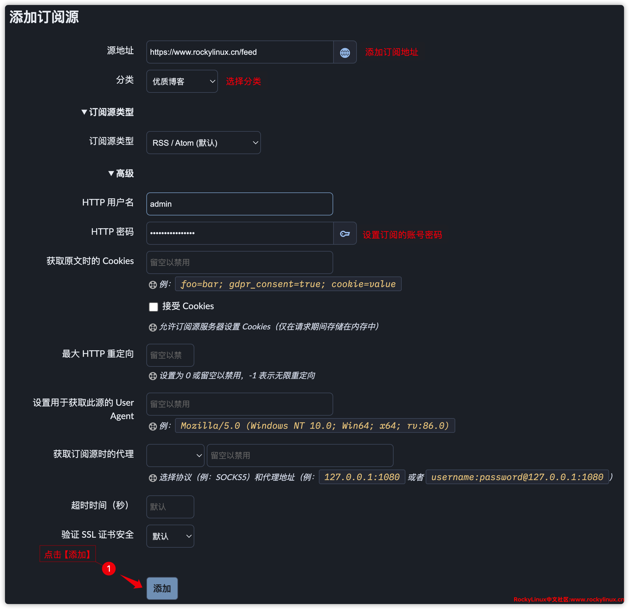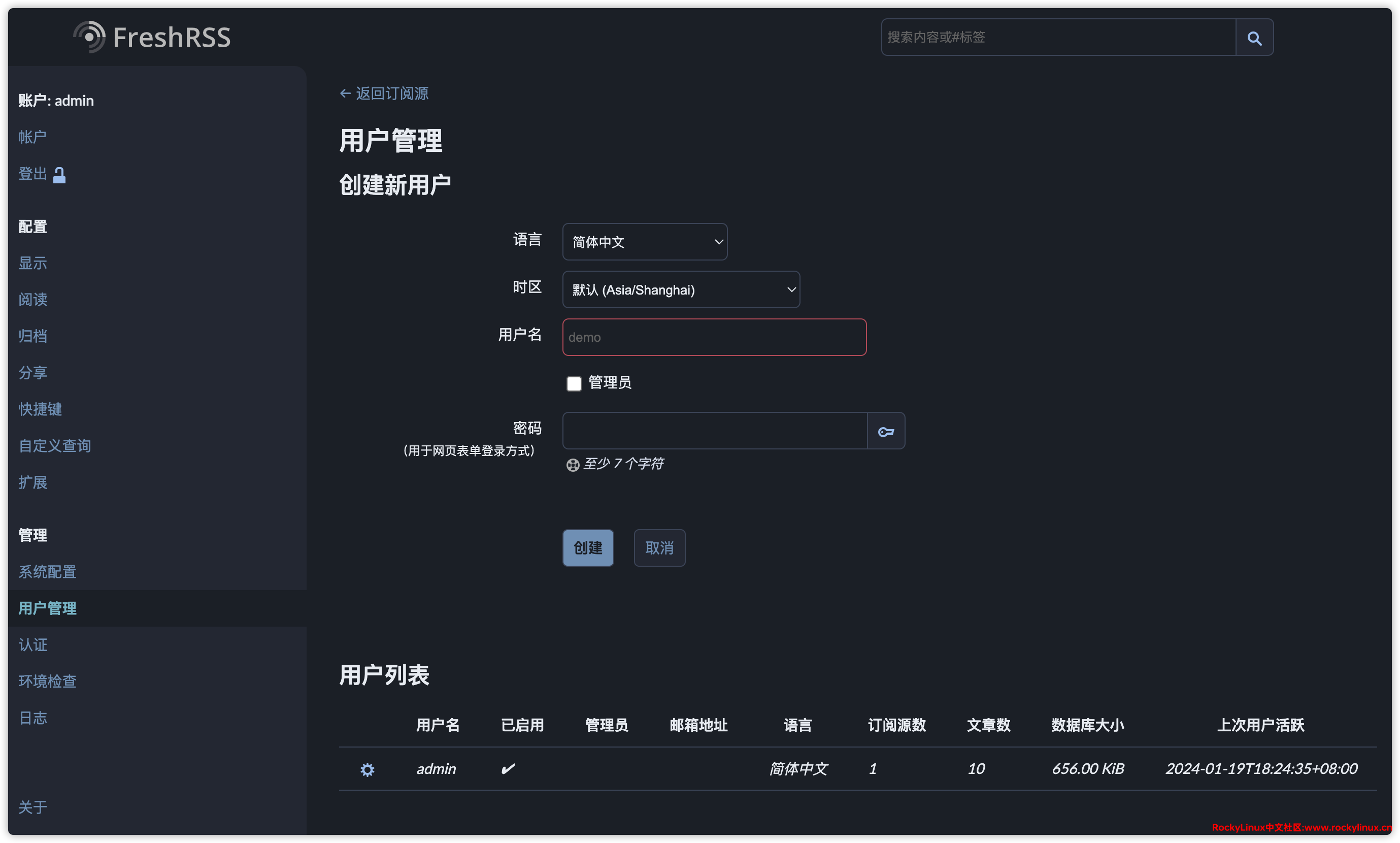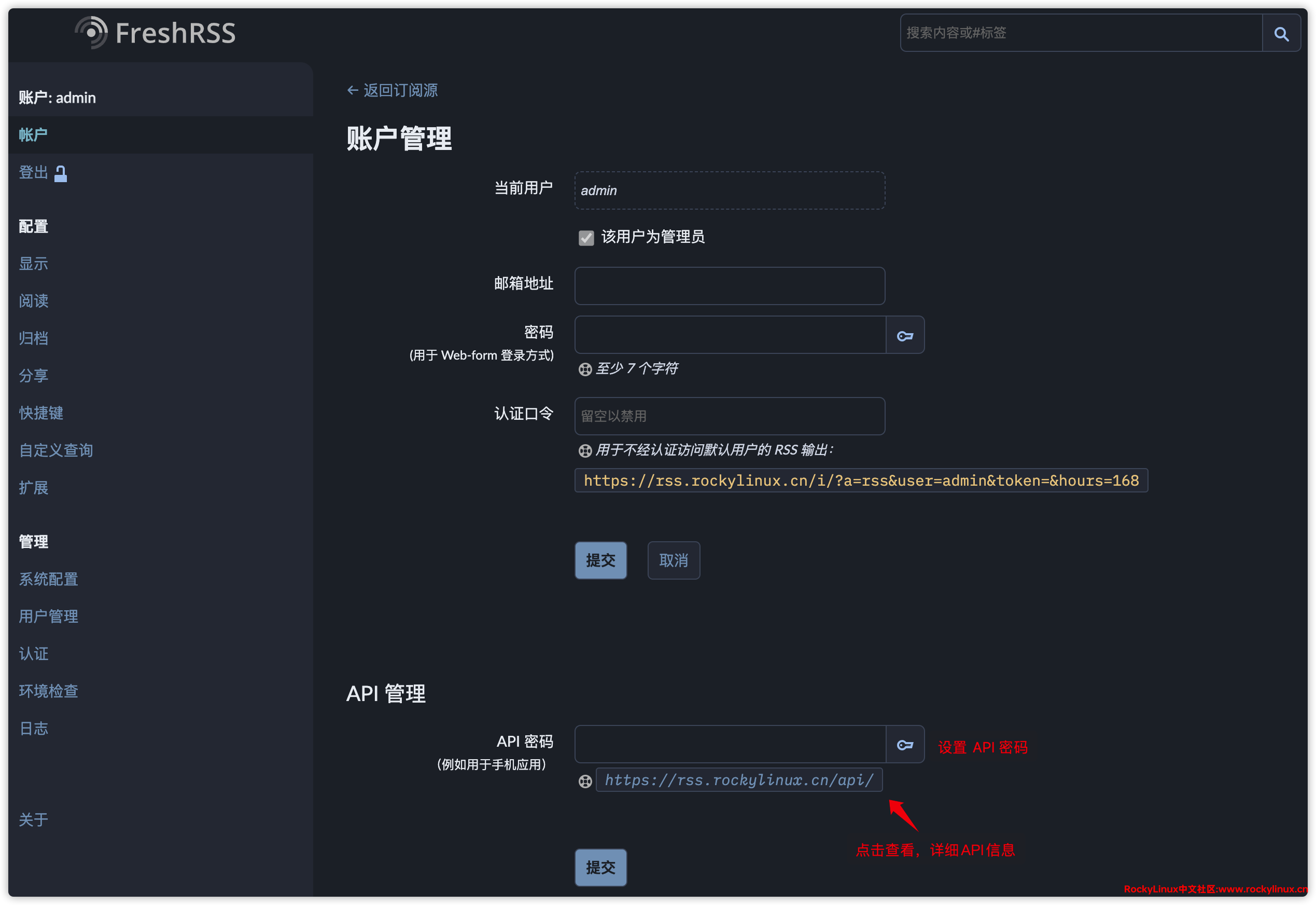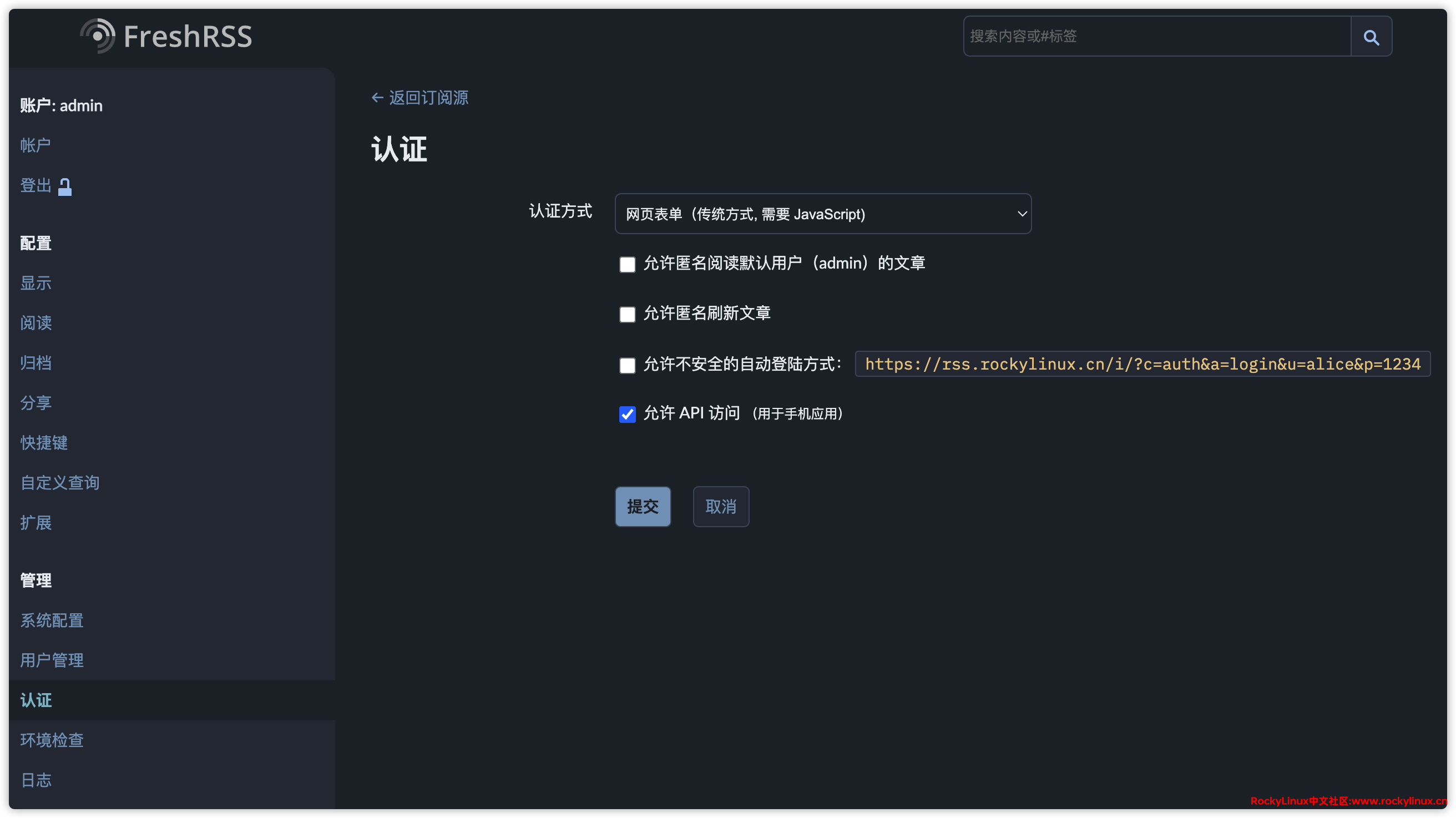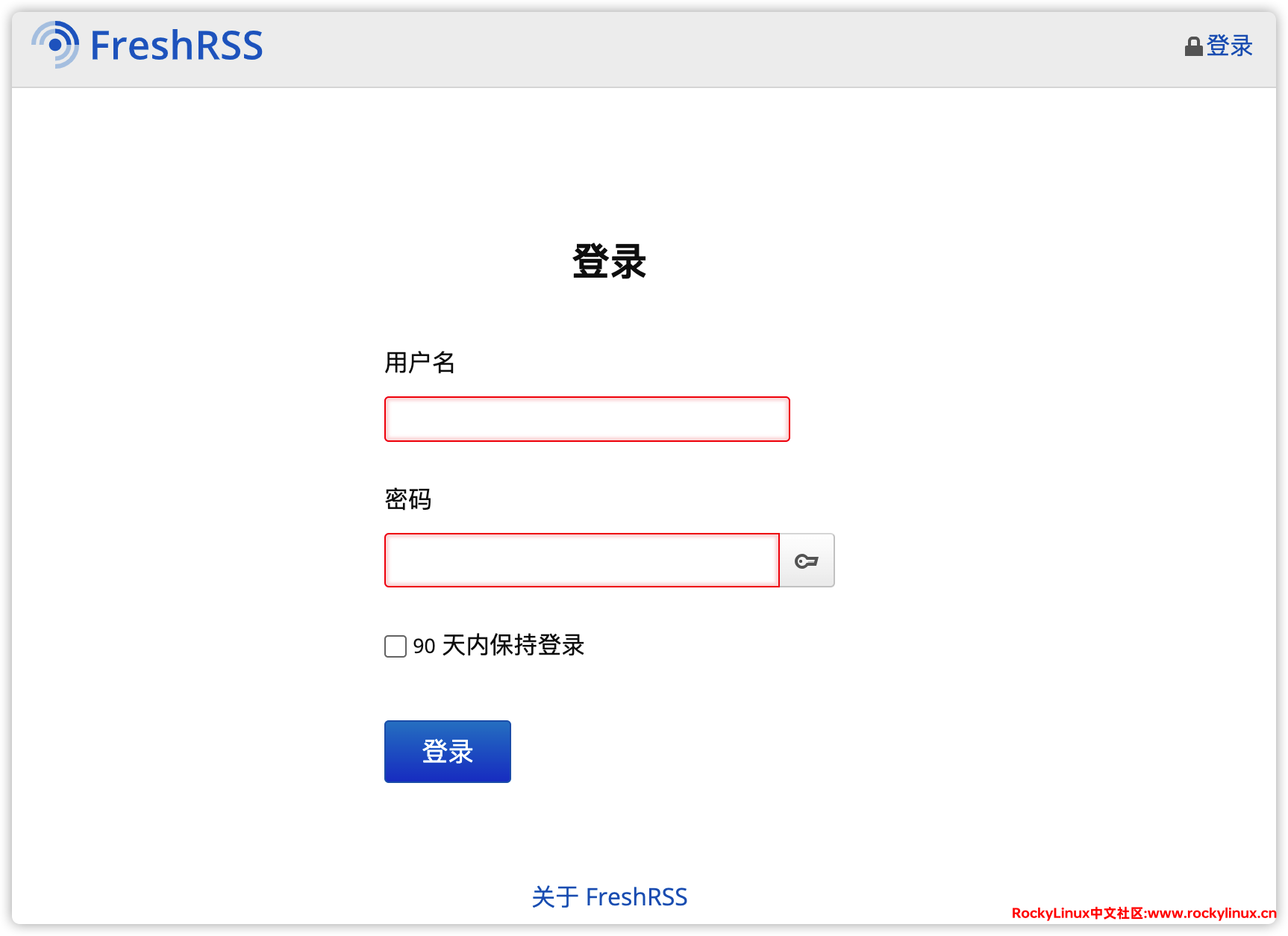FreshRSS 的基础设置这里不做详细介绍,主要介绍一下怎样添加订阅以及怎样开启 API 管理功能。打开 https://rss.rockylinux.cn 账号密码为我们在 docker-compose.yaml 中设置的账号密码,输入后,点击【登录】。