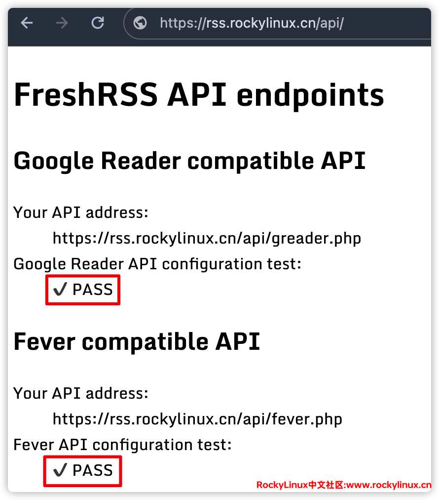 API 密码设置下方有一个 API 连接地址,点击进去,查看详细的 API 信息。如果 Google Reader API 和 Fever API 两项都显示 ✓PASS,则恭喜您,您的服务器一切正常。对应的 API 地址可以记录下来,一会配置客户端需要用到。