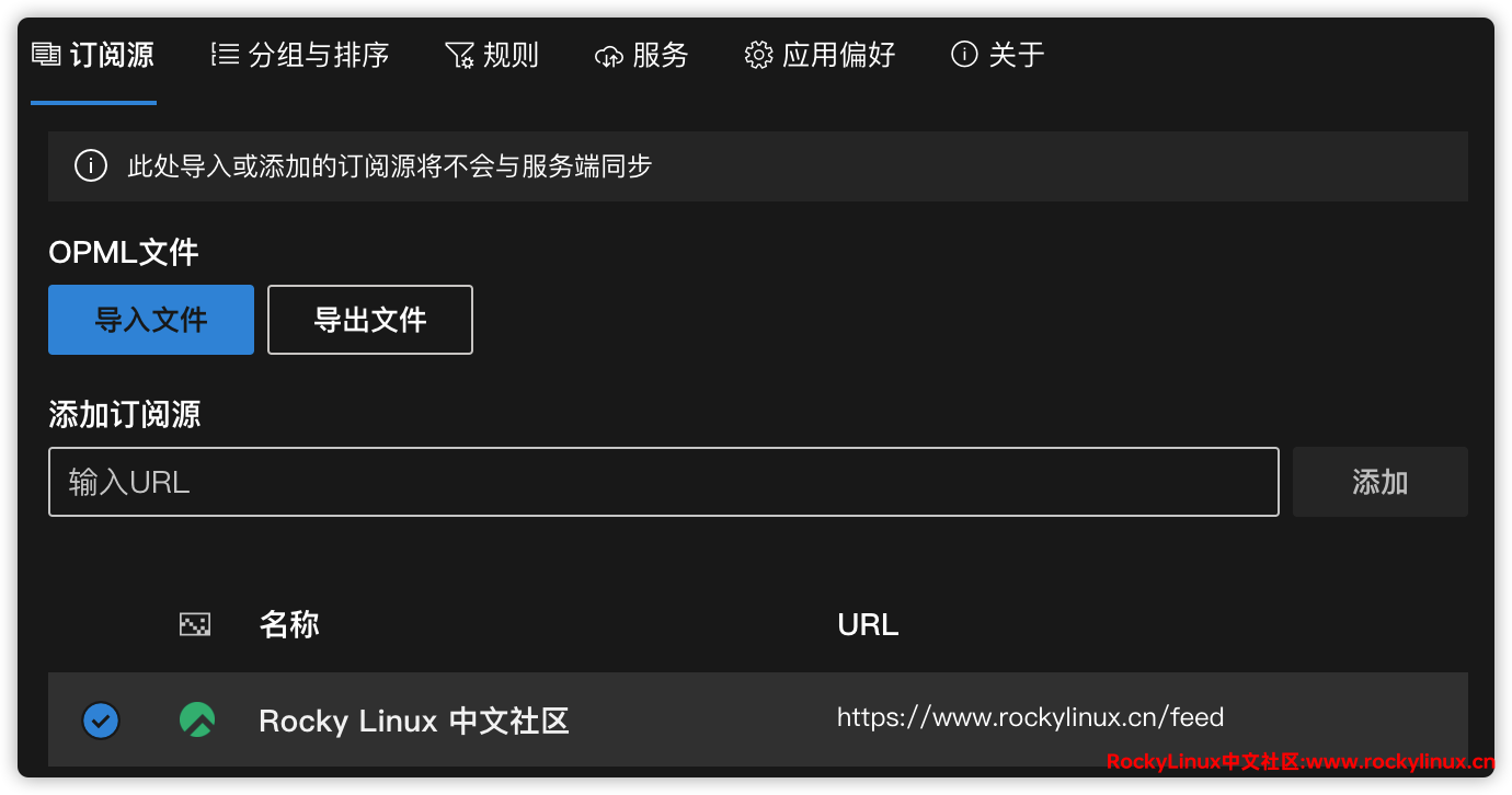 点击【服务】,选择 Google Reader API,输入端点:   https://rss.rockylinux.cn/api/greader.php ,以及登录的账号密码,保存即可。
