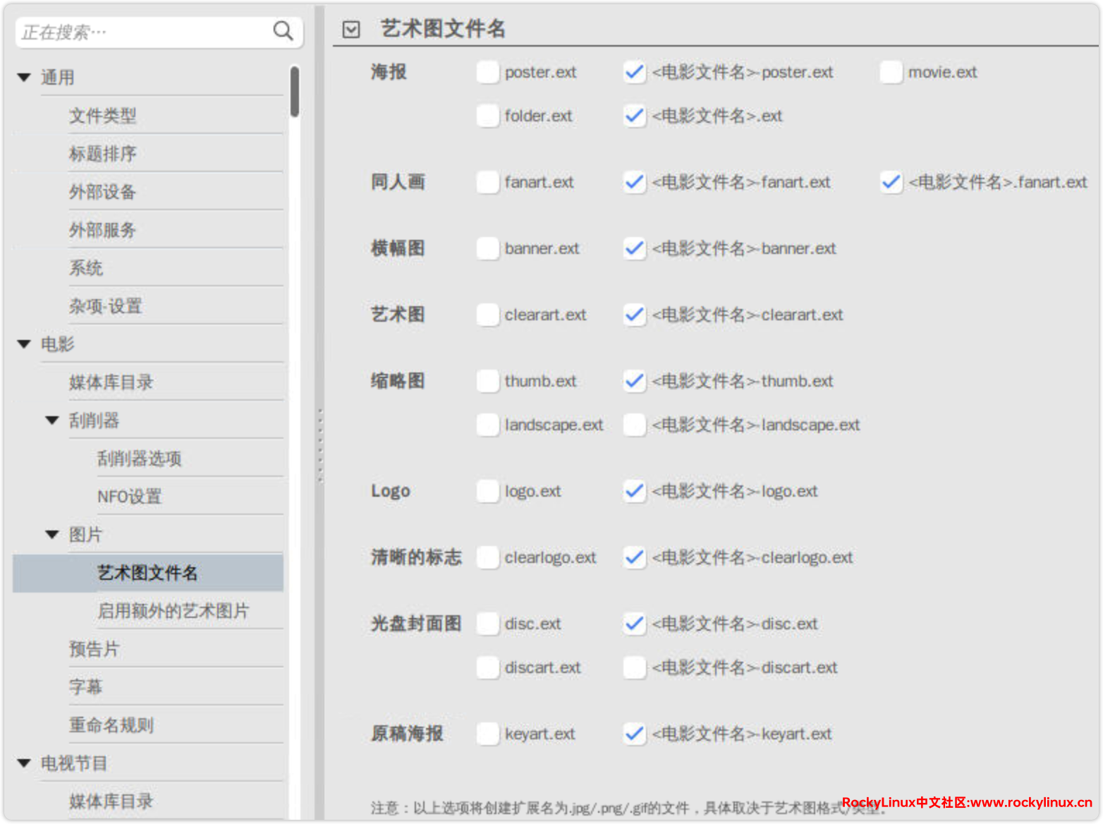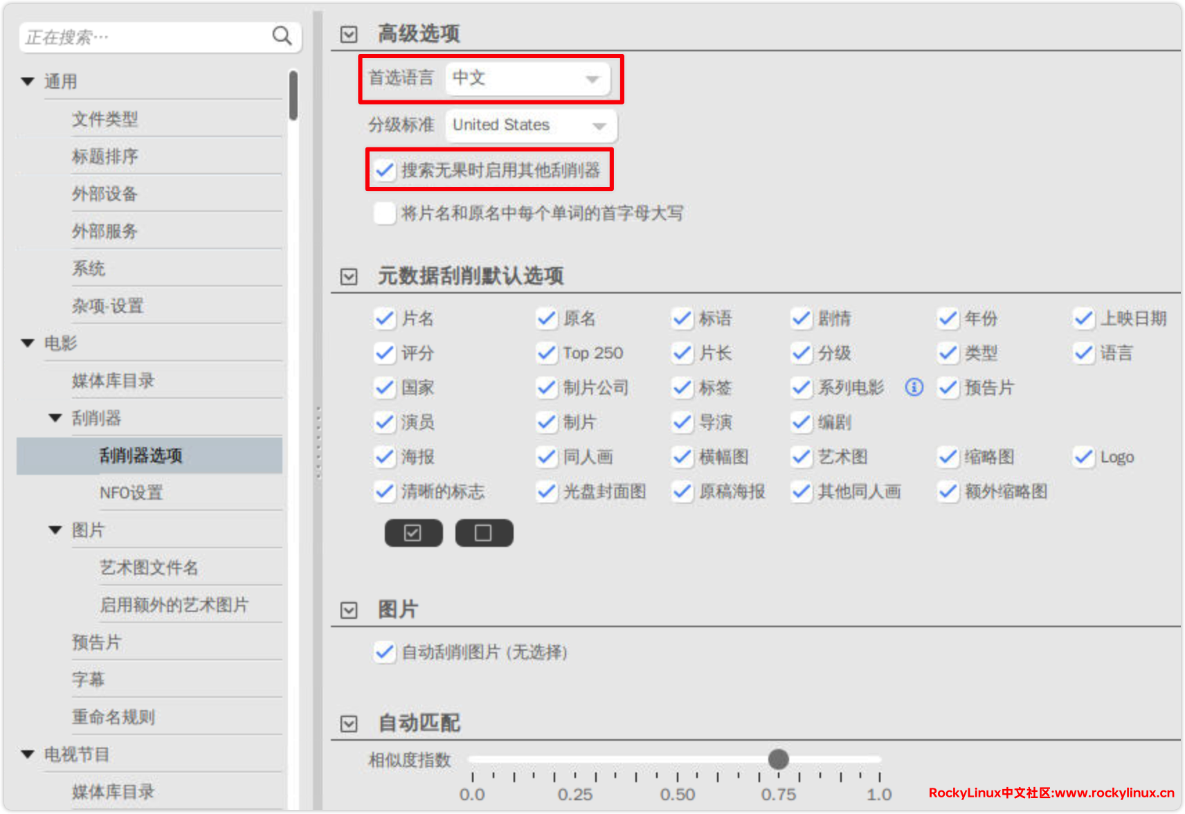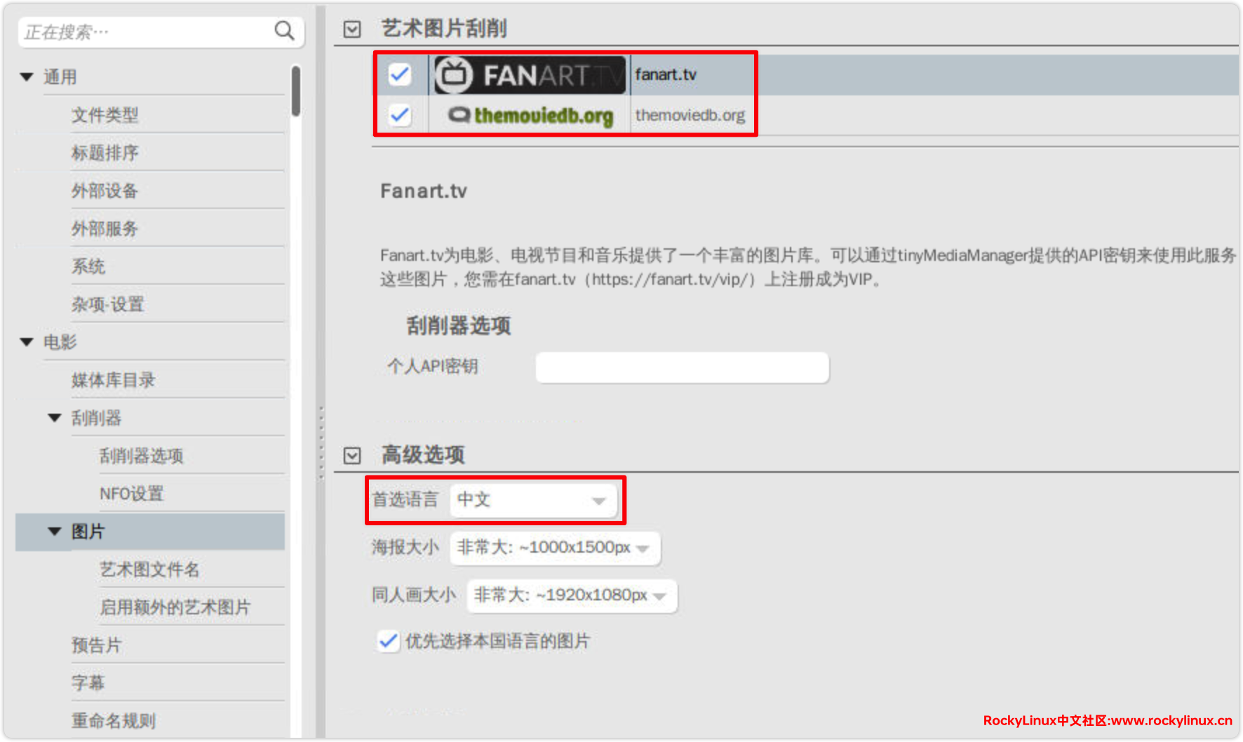 艺术图片刮削,可以多选几个刮削器进行设置,这里勾选两个,然后设置首选语言为中文。