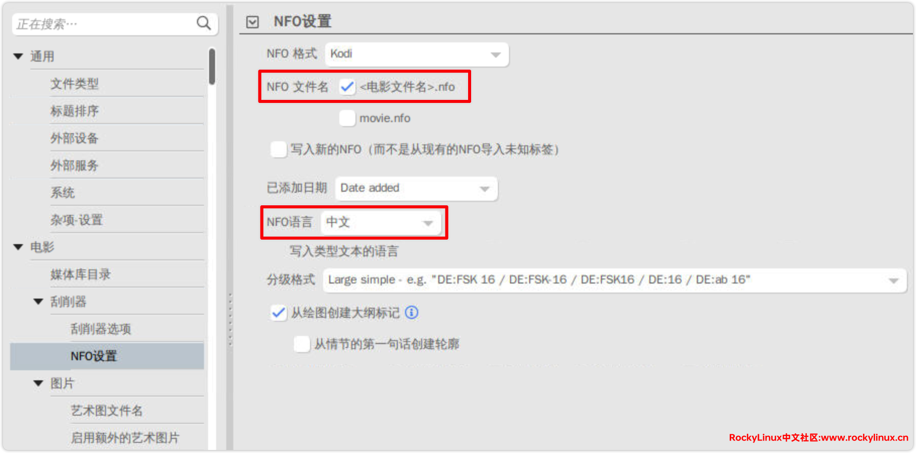 nfo 文件设置,可以选择多几个名字,便于不同软件识别 nfo 信息,语言改成中文。poster.jpg 顾名思义就是电影的海报,而 nfo 文件就是存放该媒体文件 metadata 信息的地方,用 cat 查看的话就一目了然了,其中包含着这部电影需要展示完整的信息,有了这两个文件,不管在哪个媒体管理软件中打开存放的目录就能比较漂亮的显示媒体海报墙了。