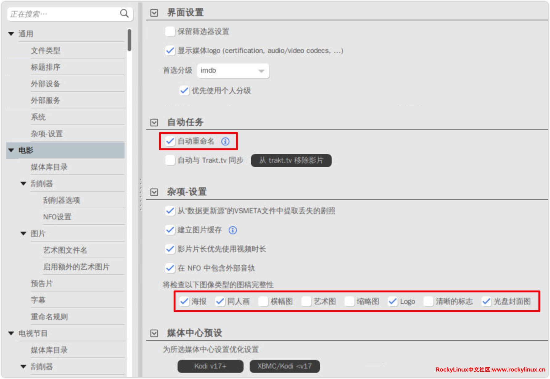设置好中文界面后,其他的设置就简单了,进入设置,选择电影,界面和自动任务可以按需求进行设置。杂项的设置最好将图片缓存和海报图像完整性选上,方便照片墙的设置。