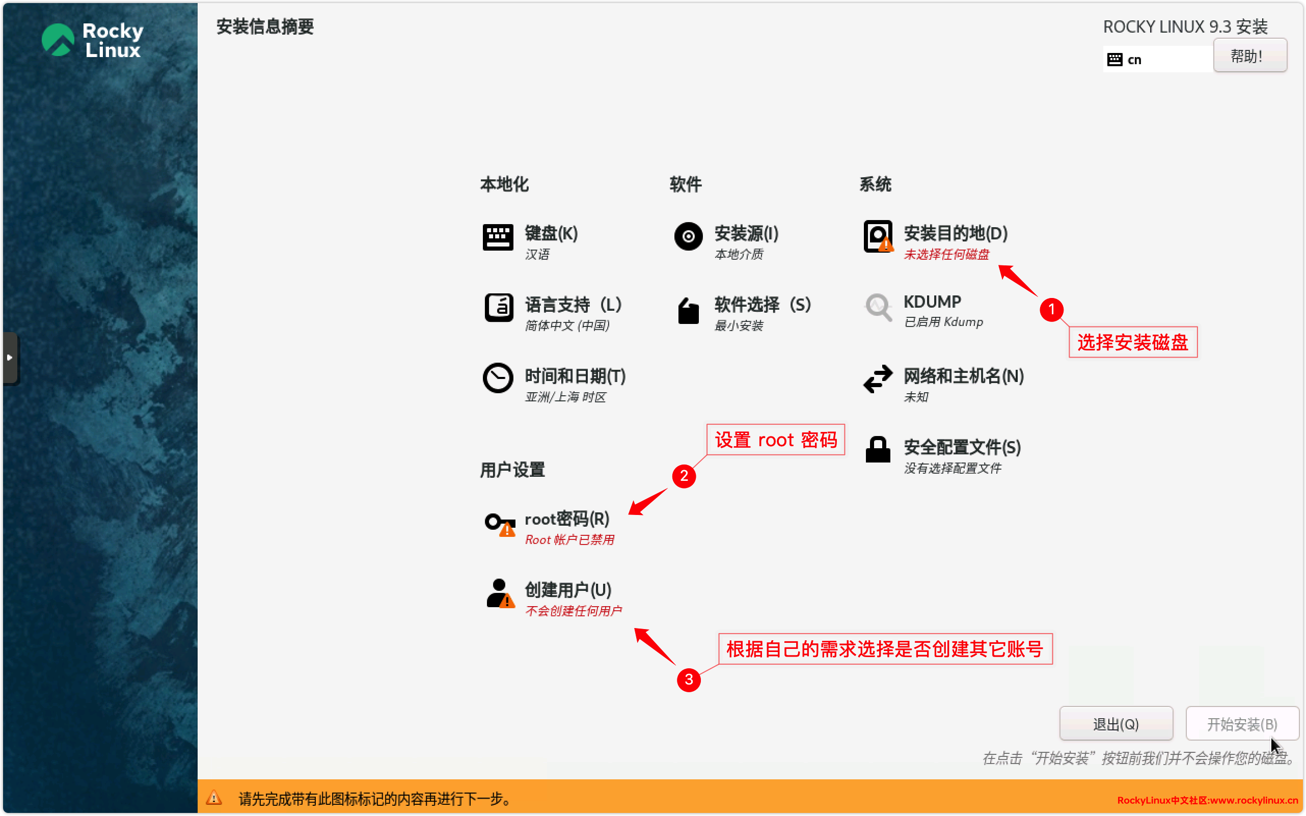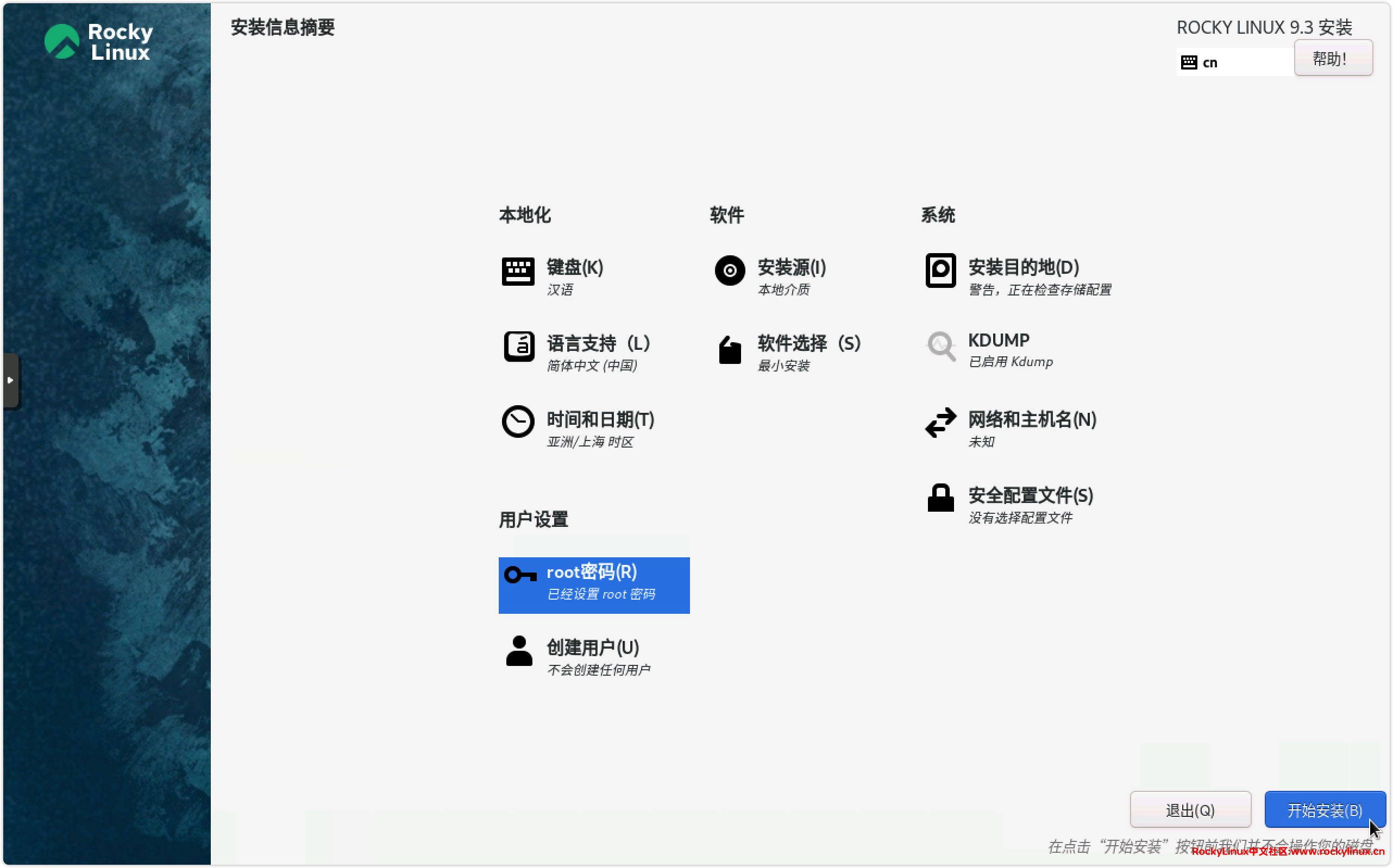11) 设置安装目的地、root 密码等,点击【开始安装】 。