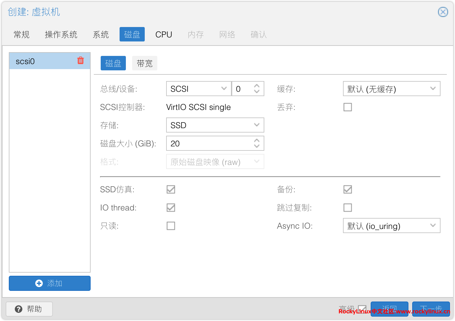 4) 磁盘设置,总线类型:SCSI,磁盘大小:20 GB,启用 SSD 仿真。