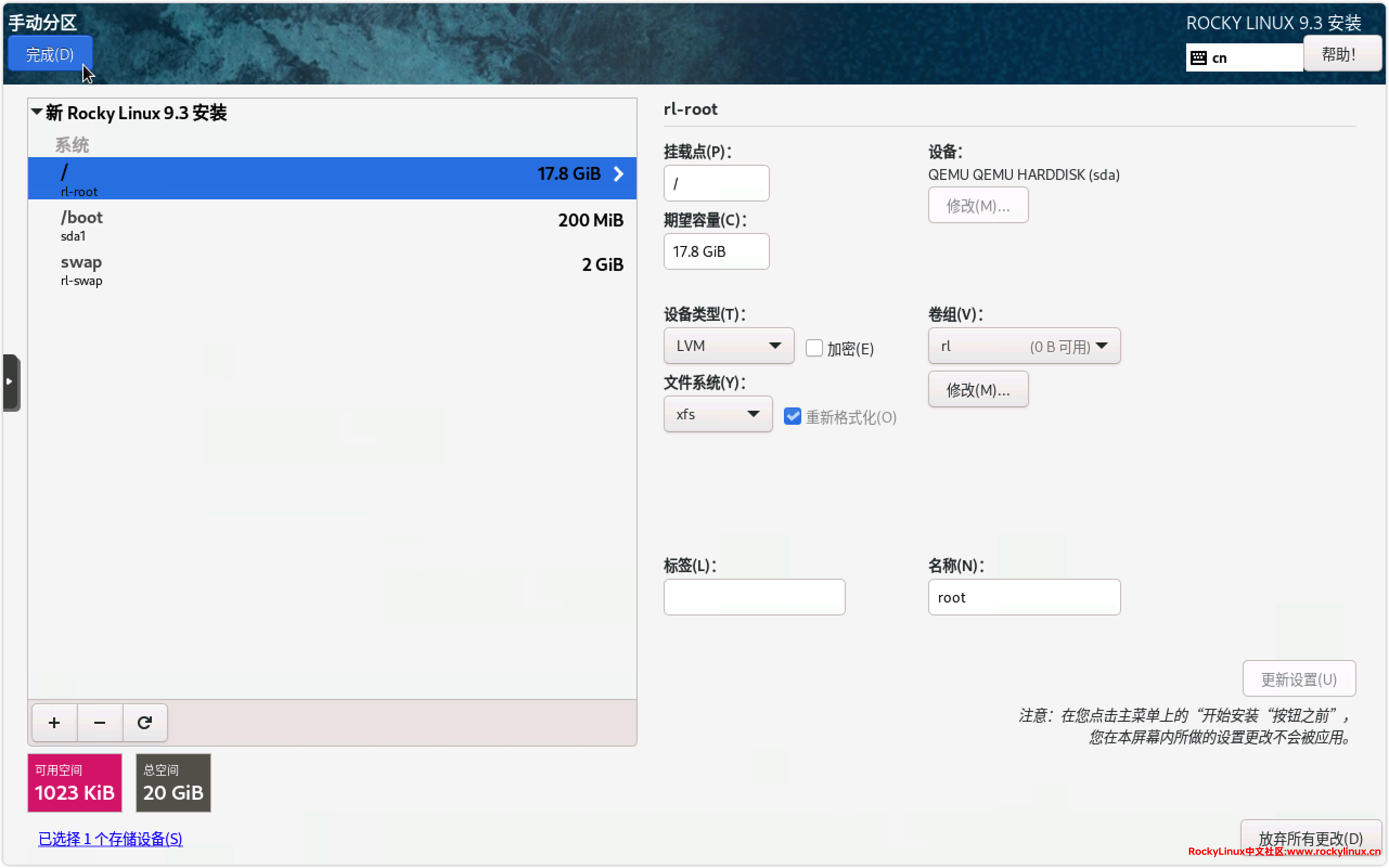 15) 我们这里设置 /boot 分区 200 MiB,swap 交换分区 2 GiB,其它的空间都给到 / 根分区,同时这里我们可以看到 Rocky Linux 默认文件系统为 xfs,我们可以根据自己的实际需要进行调整。另外后期如果是在 OpenStack、Proxmox、ESXI 等虚拟化环境中,我们可以根据需求单独挂载一个磁盘用于指定用途,将系统盘与数据盘完全分开。