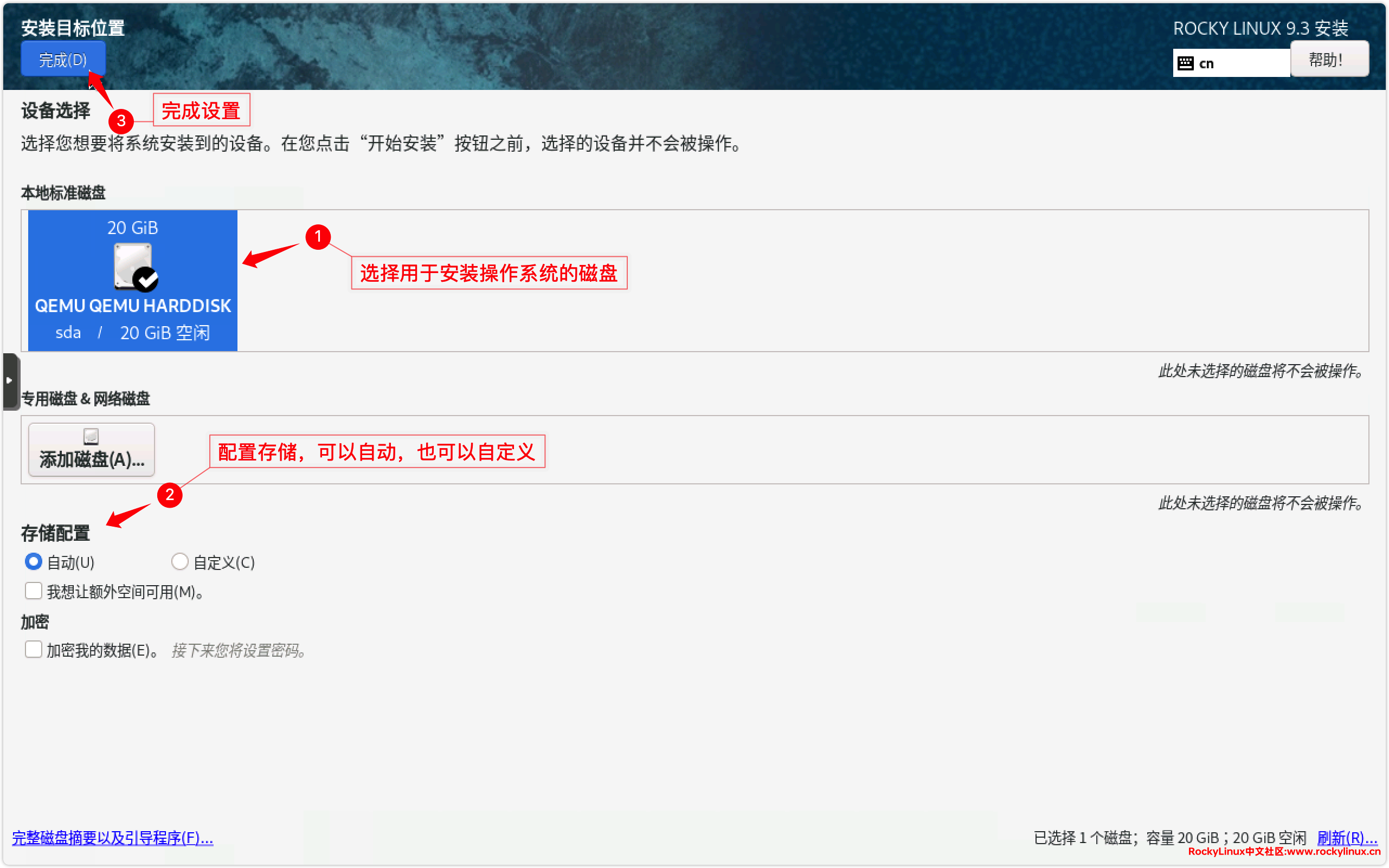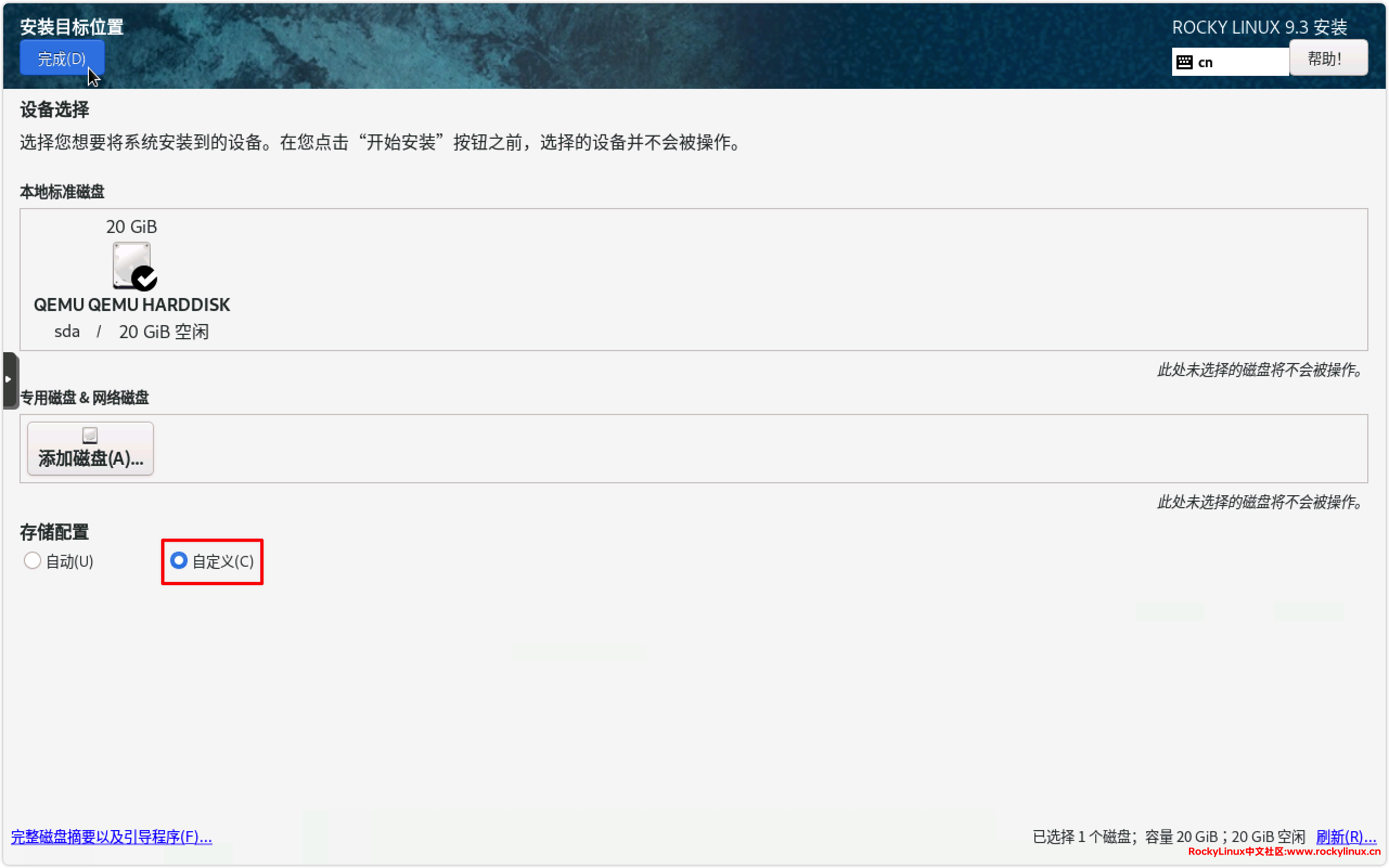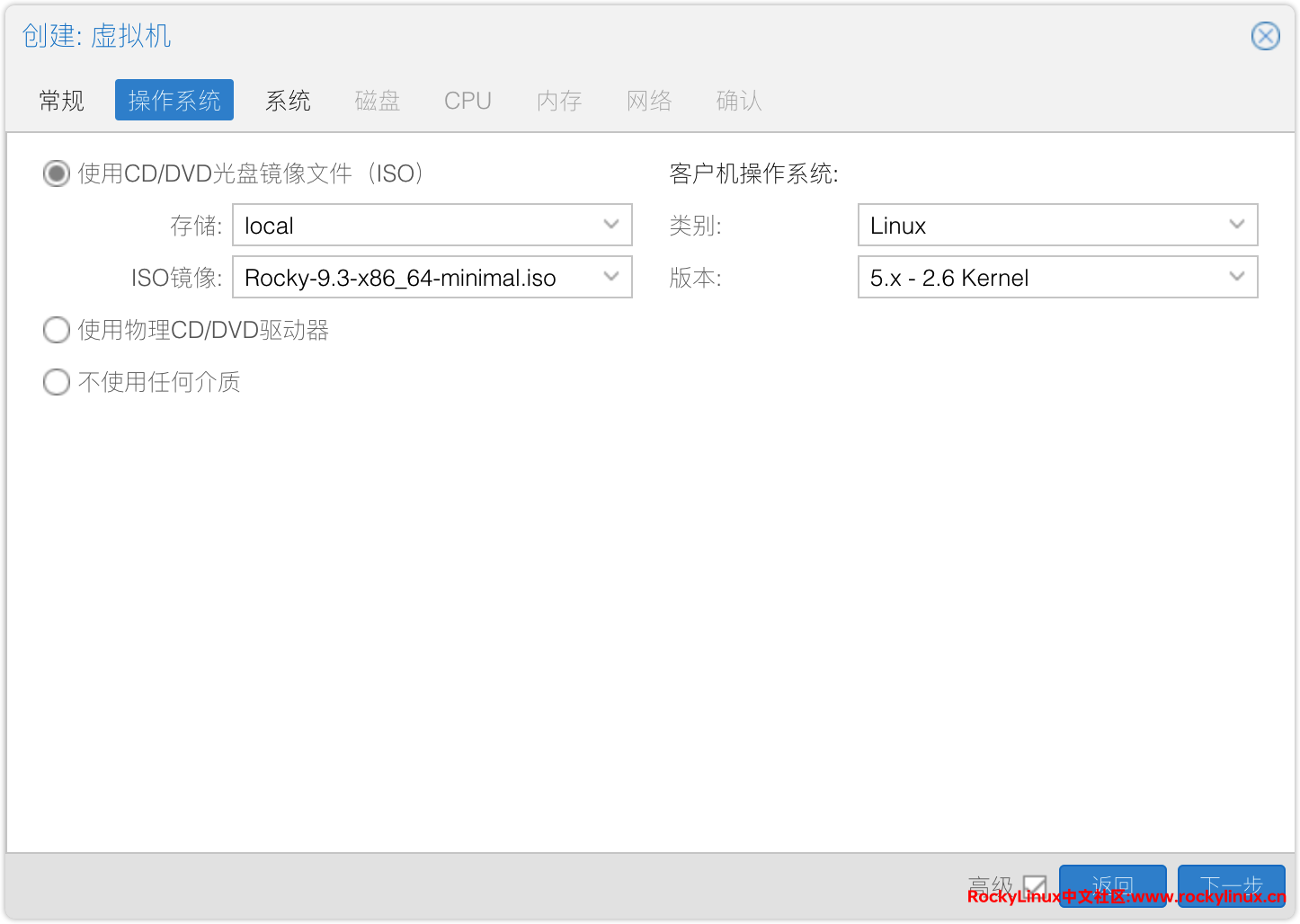 2) 配置系统镜像,选择我们刚刚下载的镜像 Rocky-9.3-x86_64-minimal.iso。