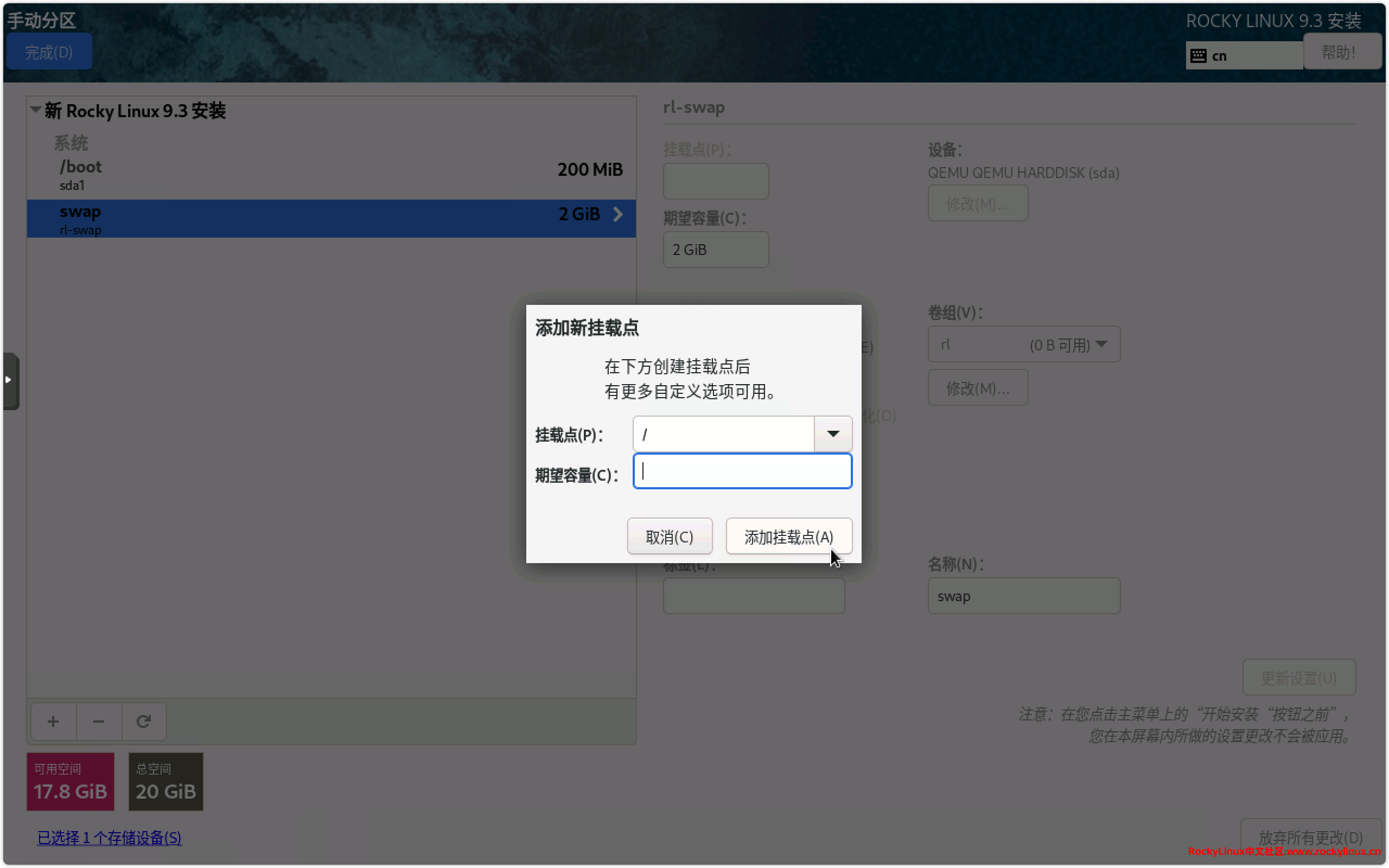 14) 这时候会进到手动分区界面,设置挂载点及期望容量,点击【添加挂载点 (A)】。