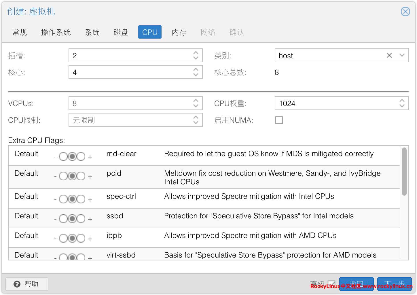 5) CPU 设置:2 Sockets 4 Cores,类别: host,不然启动会出现报错:end Kernel panic - not syncing: Attempted to kill init! exit code=0x00007f00,错误参考链接:创建VM时内核崩溃。