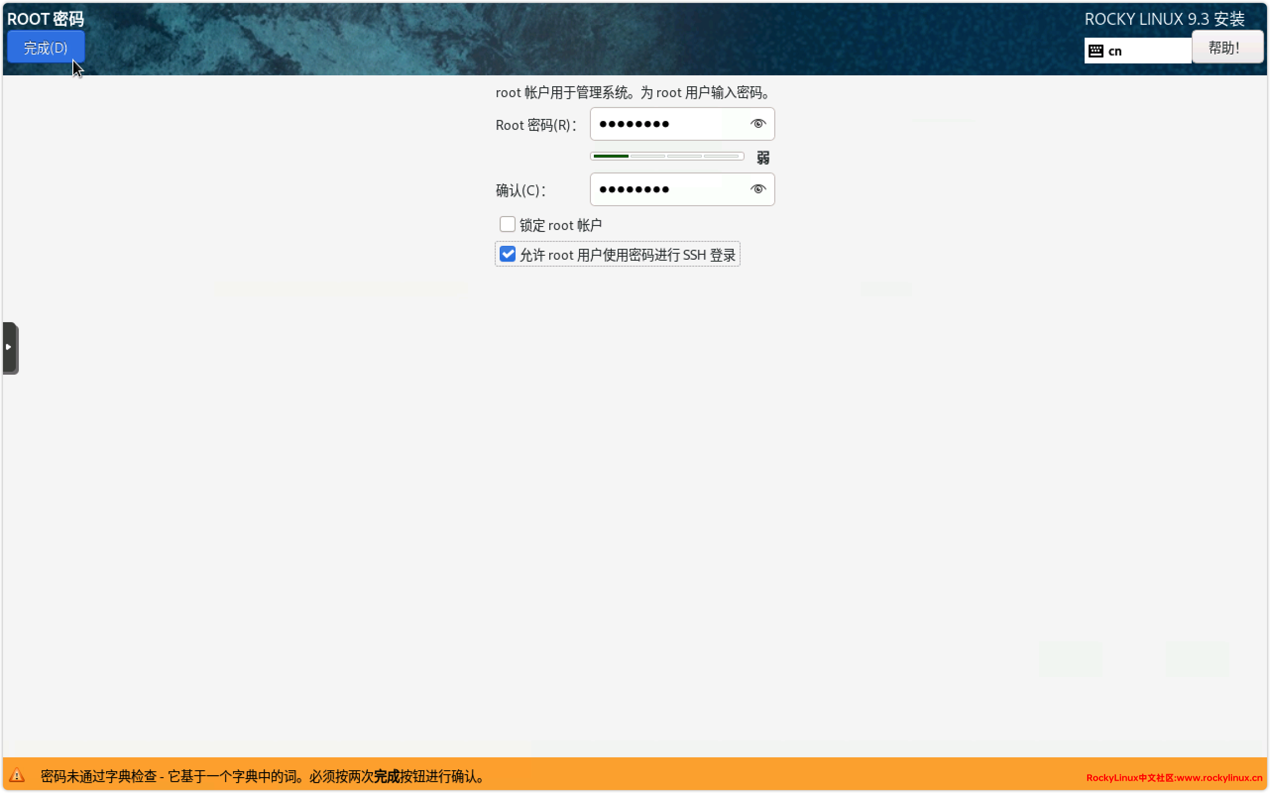 17) root 密码设置,建议采用强密码策略,这样可以避免密码被黑客破解,后期建议初始化系统后,将密码登录禁用,使用密钥进行管理。因为我们这里不设置其它账号,所以需要勾选【允许 root 用户使用密码进行 SSH 登录】。