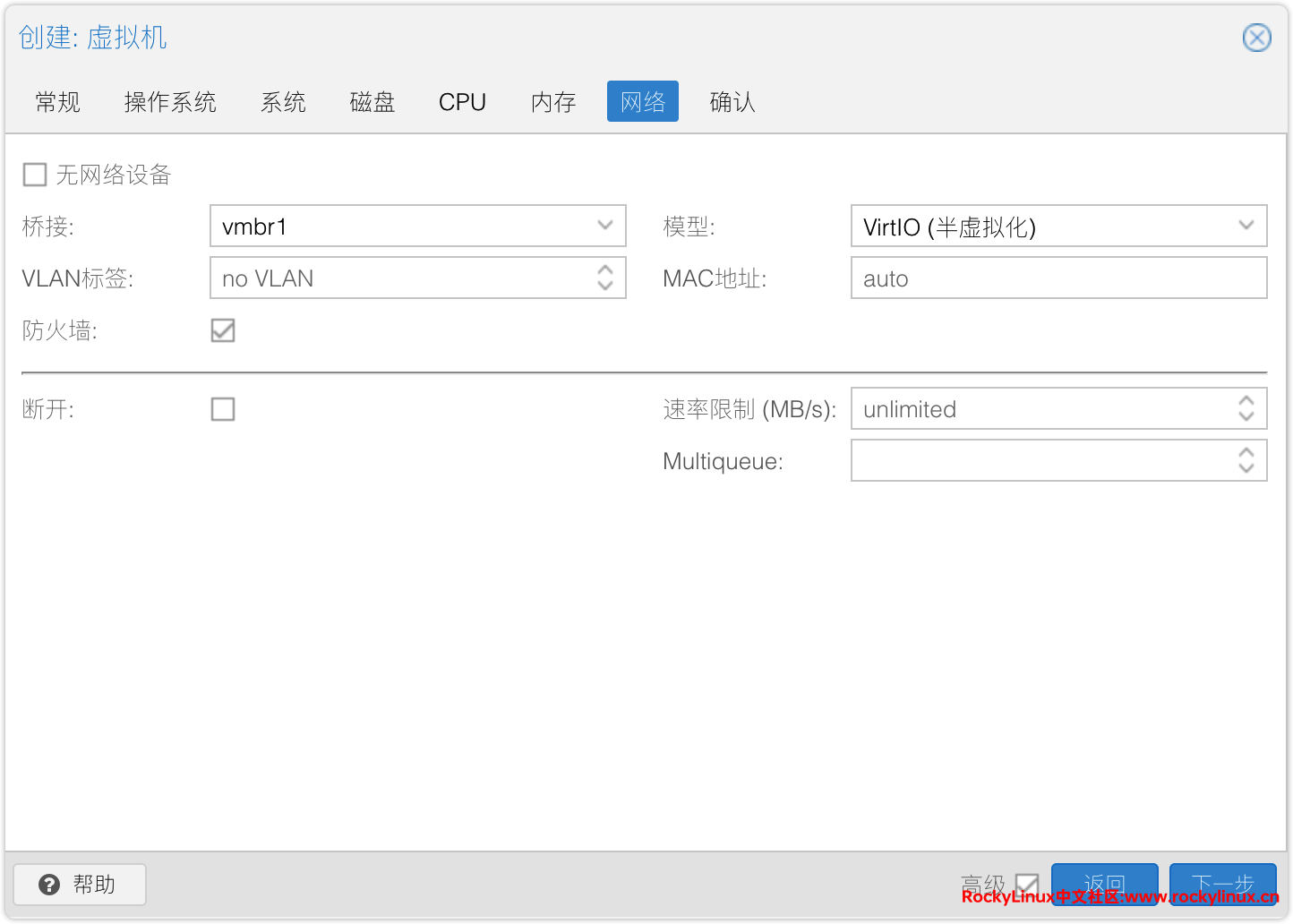 7) 网卡模型:VirtIO,选择对应桥接设备,如果有划分不同的 VLAN,还需要打开 VLAN Tag 。