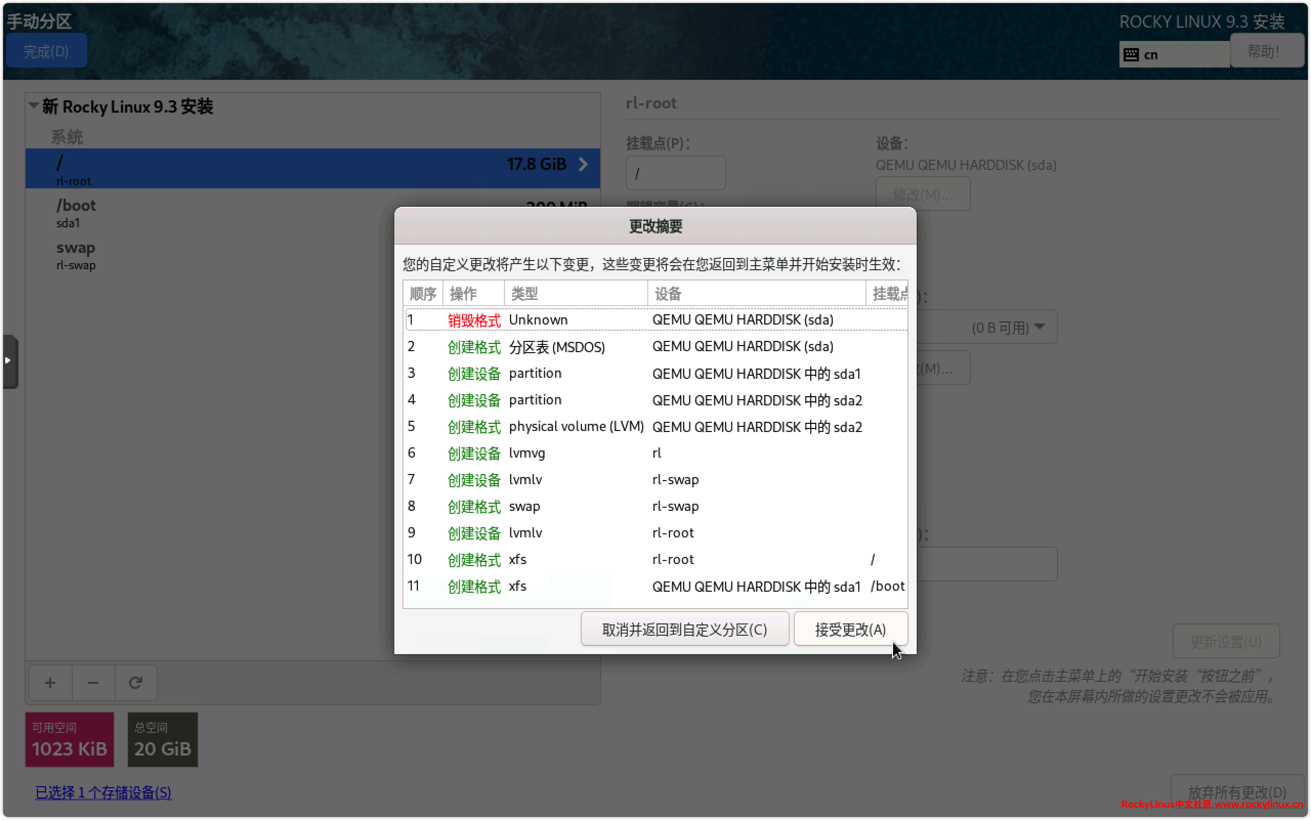 16) 点击【接受更改】,完成自定义分区设置。