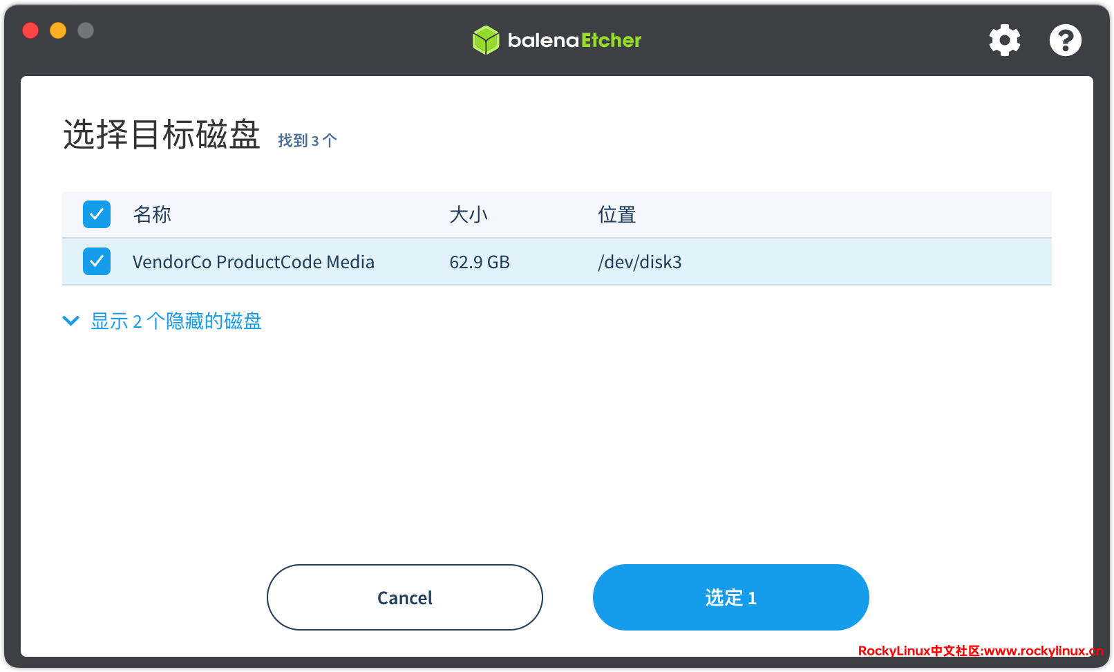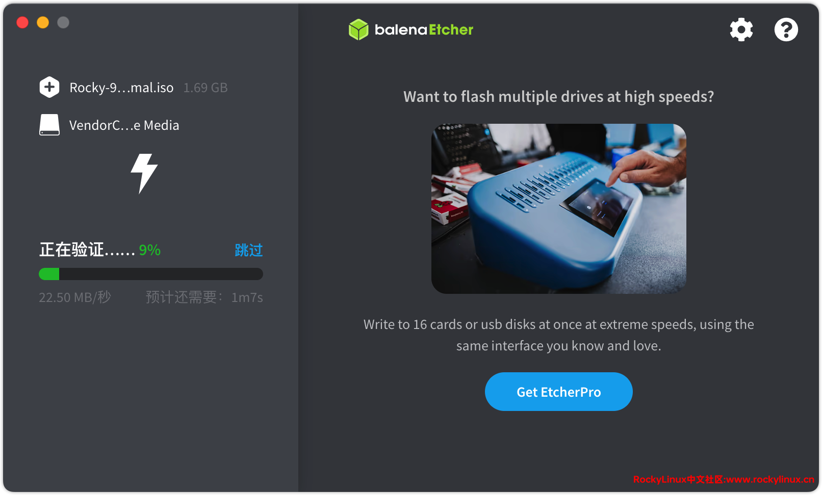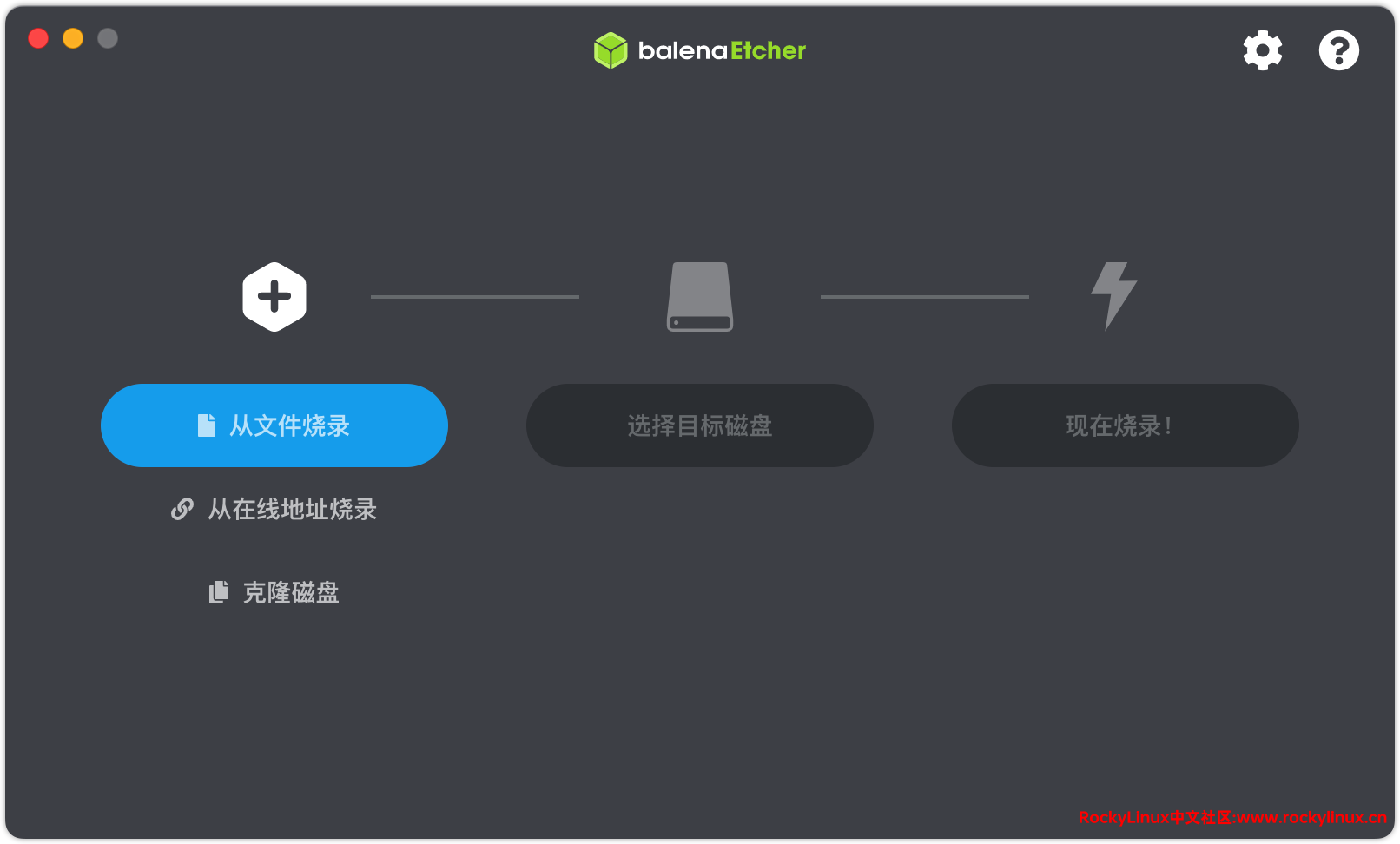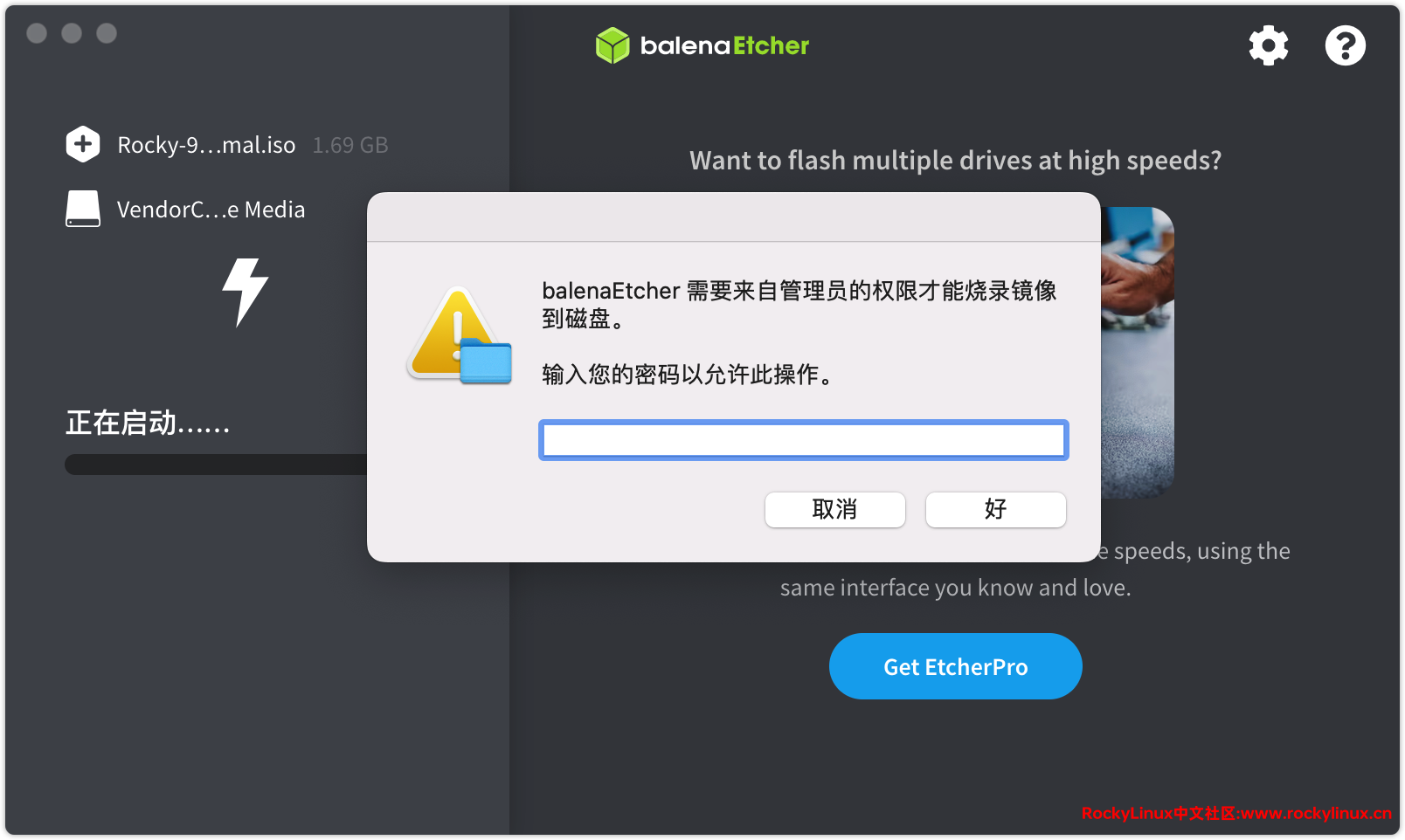 这里以 macOS 操作系统上使用 Etcher 软件进行刻录为例,软件安装过程略。