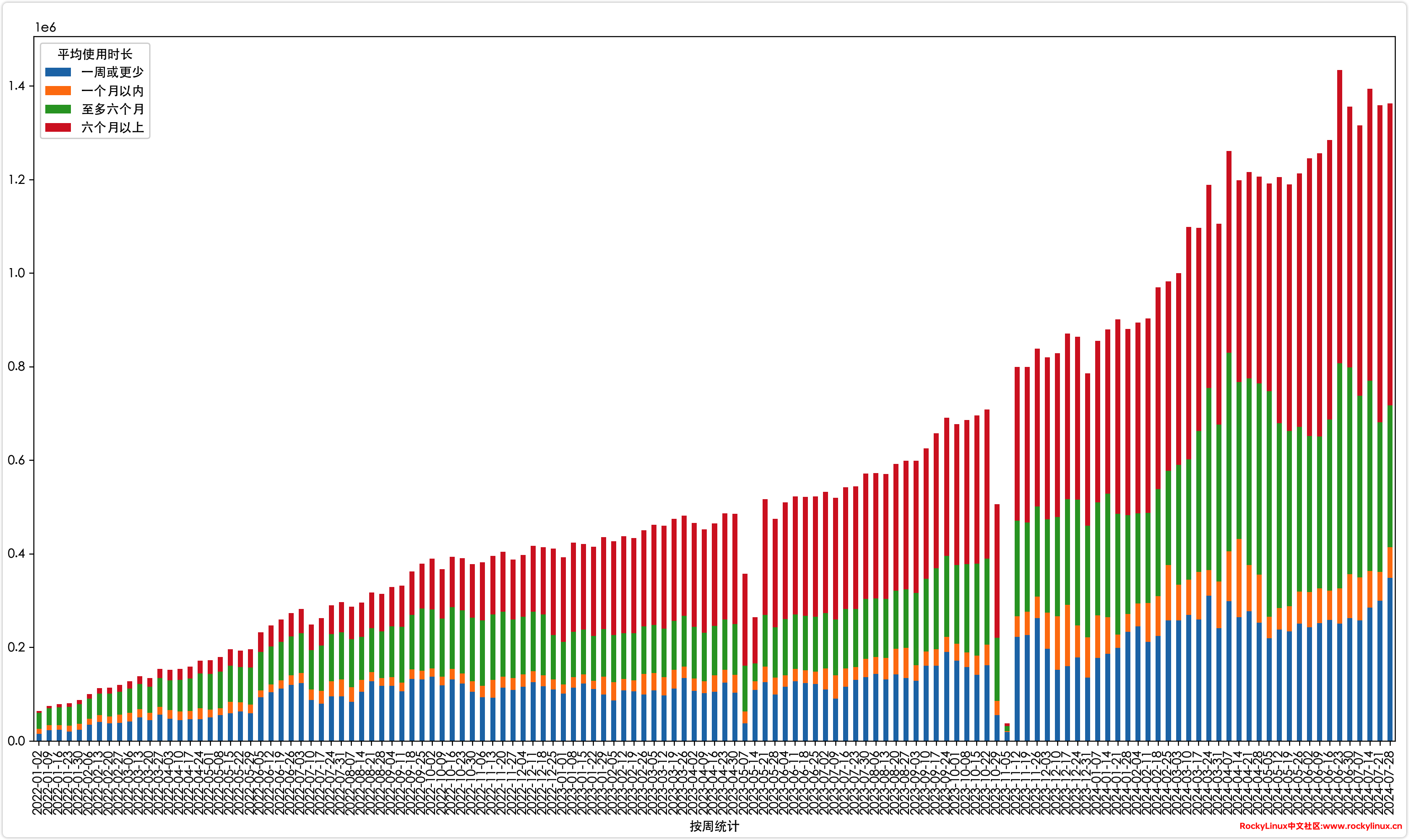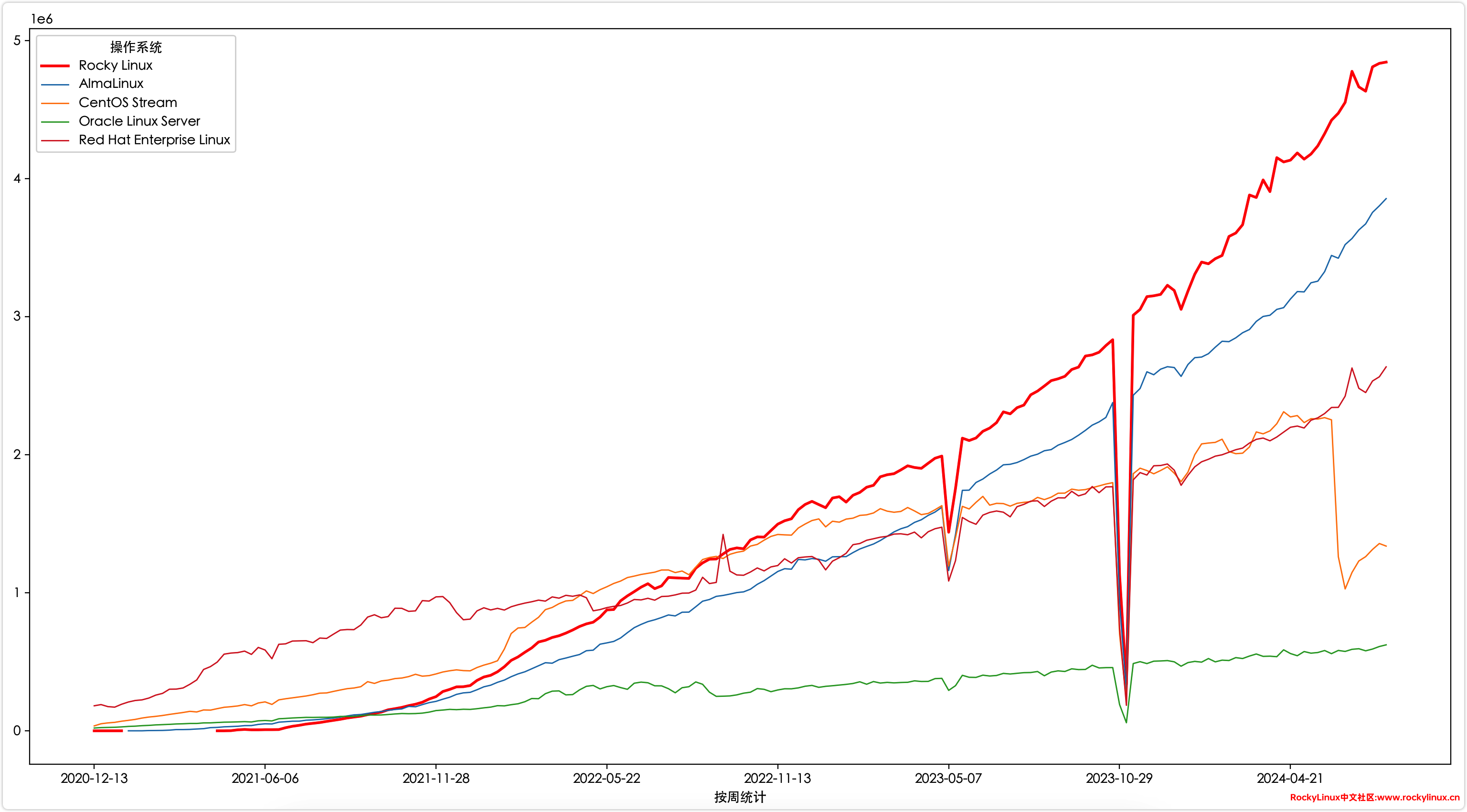 为了更好地了解 Rocky Linux 在社区中的接受度和使用情况,我们对 EPEL(Extra Packages for Enterprise Linux)数据进行了统计分析。数据显示 Rocky Linux 的包下载量和用户活跃度在过去三年中呈爆发式增长(红色线)。这表明 Rocky Linux 不仅在高校和云厂商中获得了广泛支持,也在企业和个人用户中逐渐受到欢迎。
