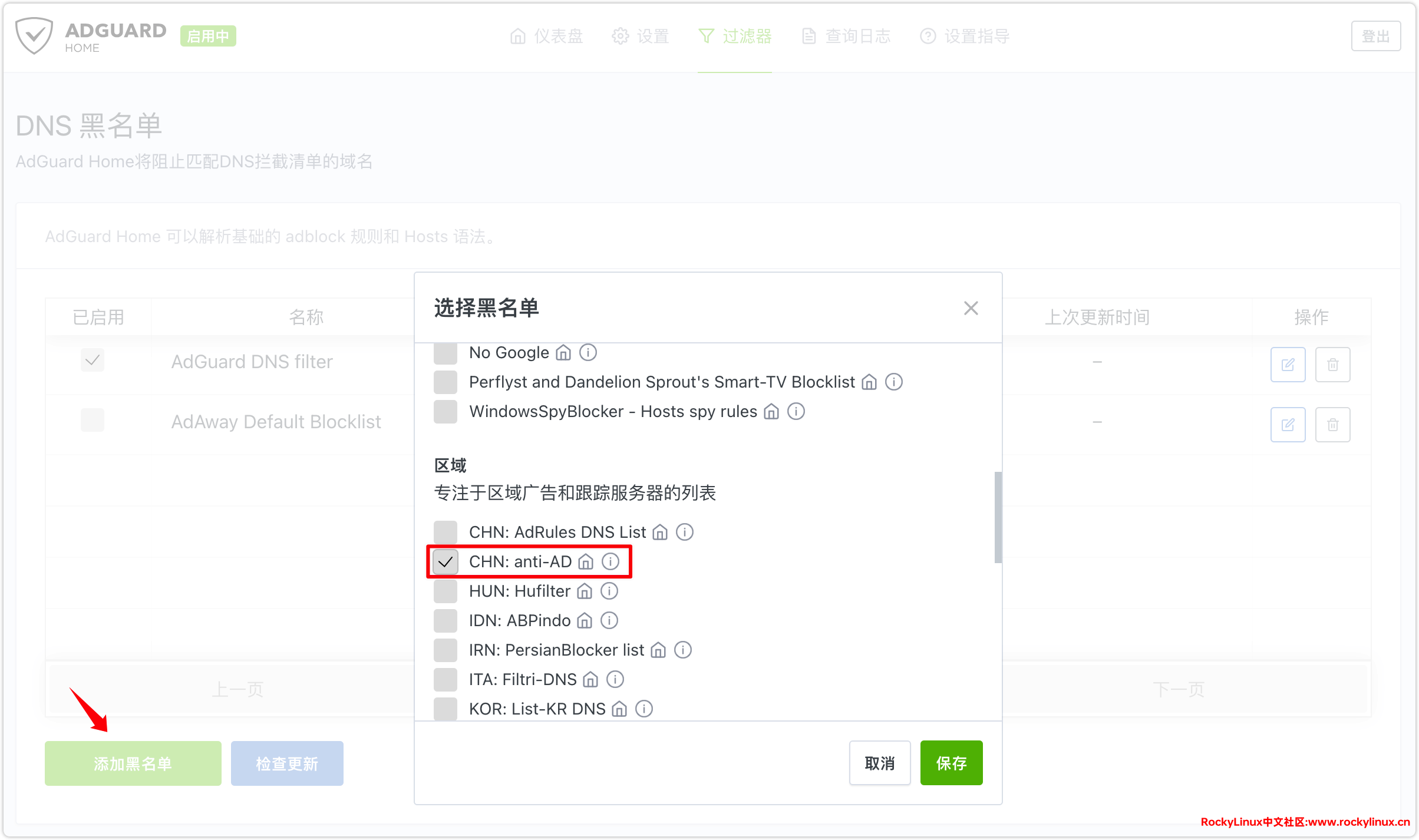 ADGuardHome 自带有一个全球黑名单列表,可以根据自己的需求配置,详细可参考: [AdGuard Host Lists Registry | HostlistsRegistry](https: //adguardteam.github.io/HostlistsRegistry/),CHN 是专门针对中国域名地址的黑名单列表。