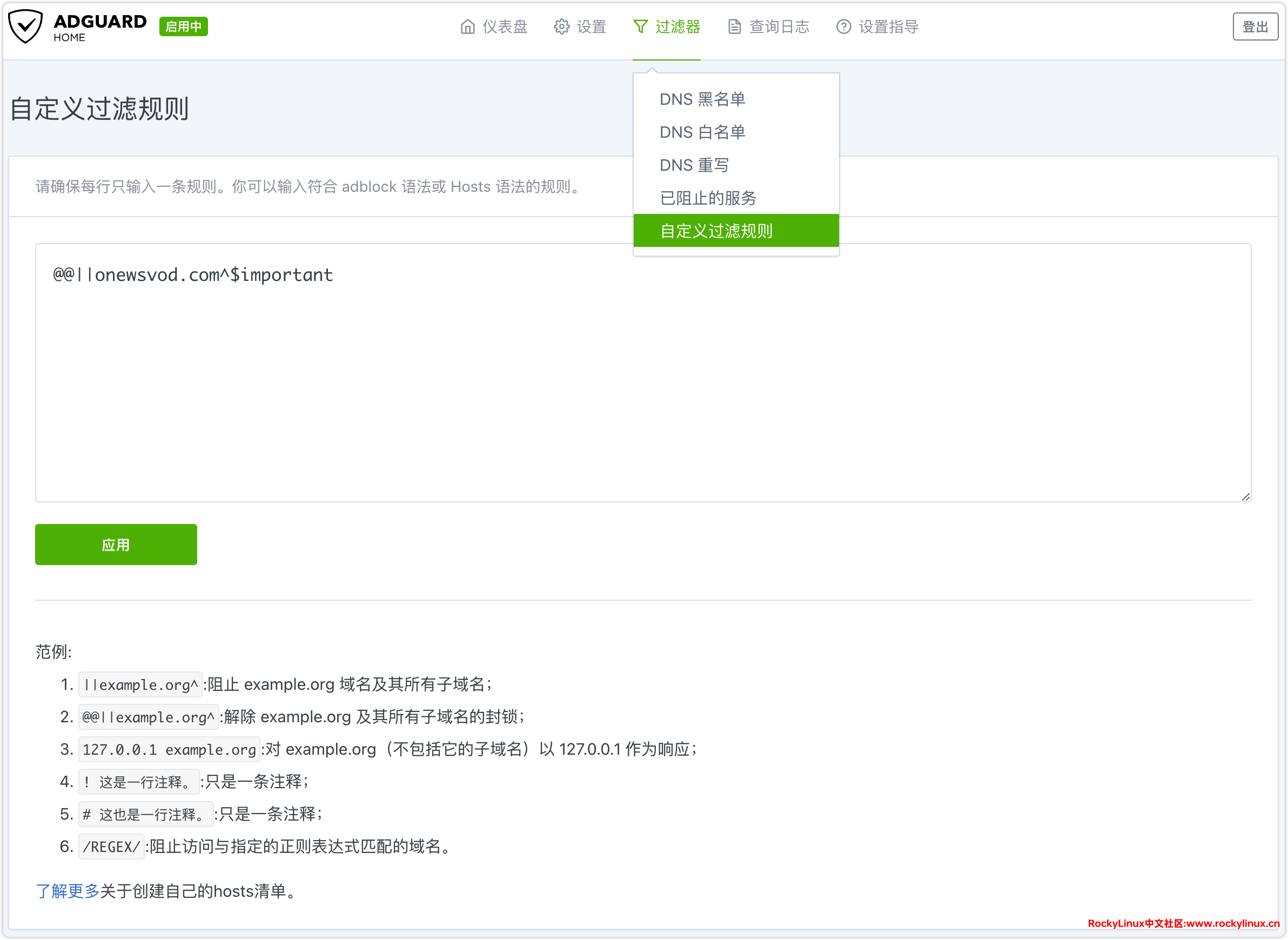 当我们有一些不想访问的网站,但在现在的 DNS 黑名单列表中又没有阻止,可以通过自定义过滤规则进行设置。