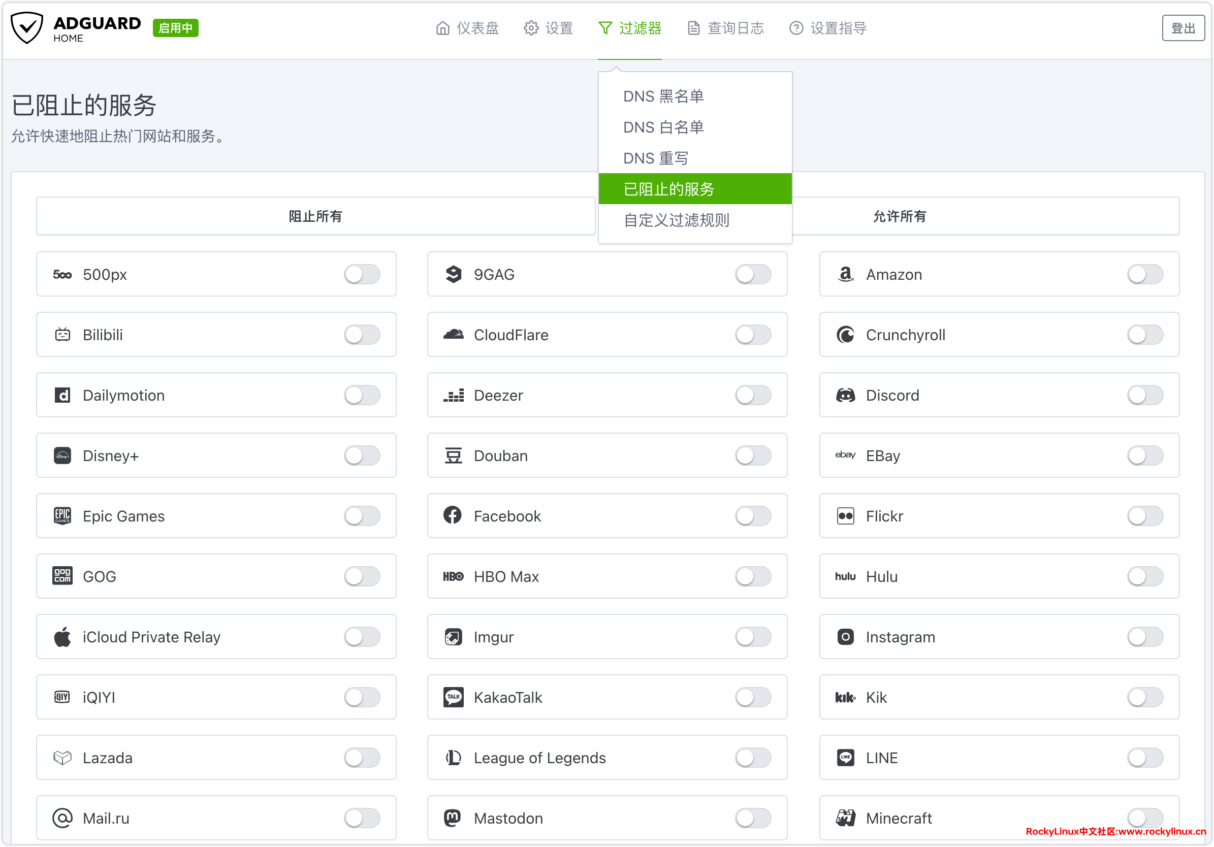 通过已阻止的服务,可以直接开启禁止访问哪个应用,比如: 禁止访问 Bilibili 等。