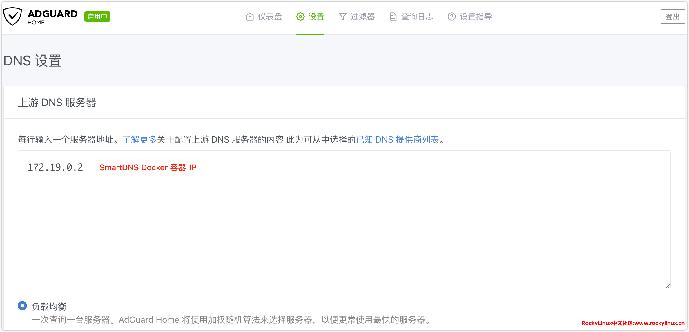 DNS 设置,可以与前面 DIY NAS系列20 -- 智能DNS管理之 SmartDNS 配合使用,设置 DNS 走对应 SmartDNS 服务,提高解析速度。因为木子的 AdGuardHome DNS 与 SmartDNS 在同一台主机上,不能够同时在两个 Docker 服务上开启 53 端口映射到宿主机,所以在 SmartDNS 启动服务的时候,并未使用宿主机的 53 端口,所以我们这里直接将 AdGuardHome DNS 的上游DNS服务器设置成 SmartDNS Docker 容器IP地址即可。