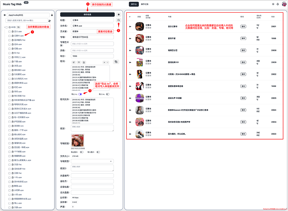 具体刮削的操作,参考下图所示,本身 music-tag-web 自动批量刮削功能,如果您不是第一次刮削,不建议使用批量刮削,这可能造成您之前整理的数据毁于一旦。建议手动指定音乐刮削,此列表分为三个模块,从左到右依次是原文件(左侧)、元数据(中间)、刮削的在线数据(右侧)。点击右侧刮削的任何数据,会自动写入中间的元数据部份。
