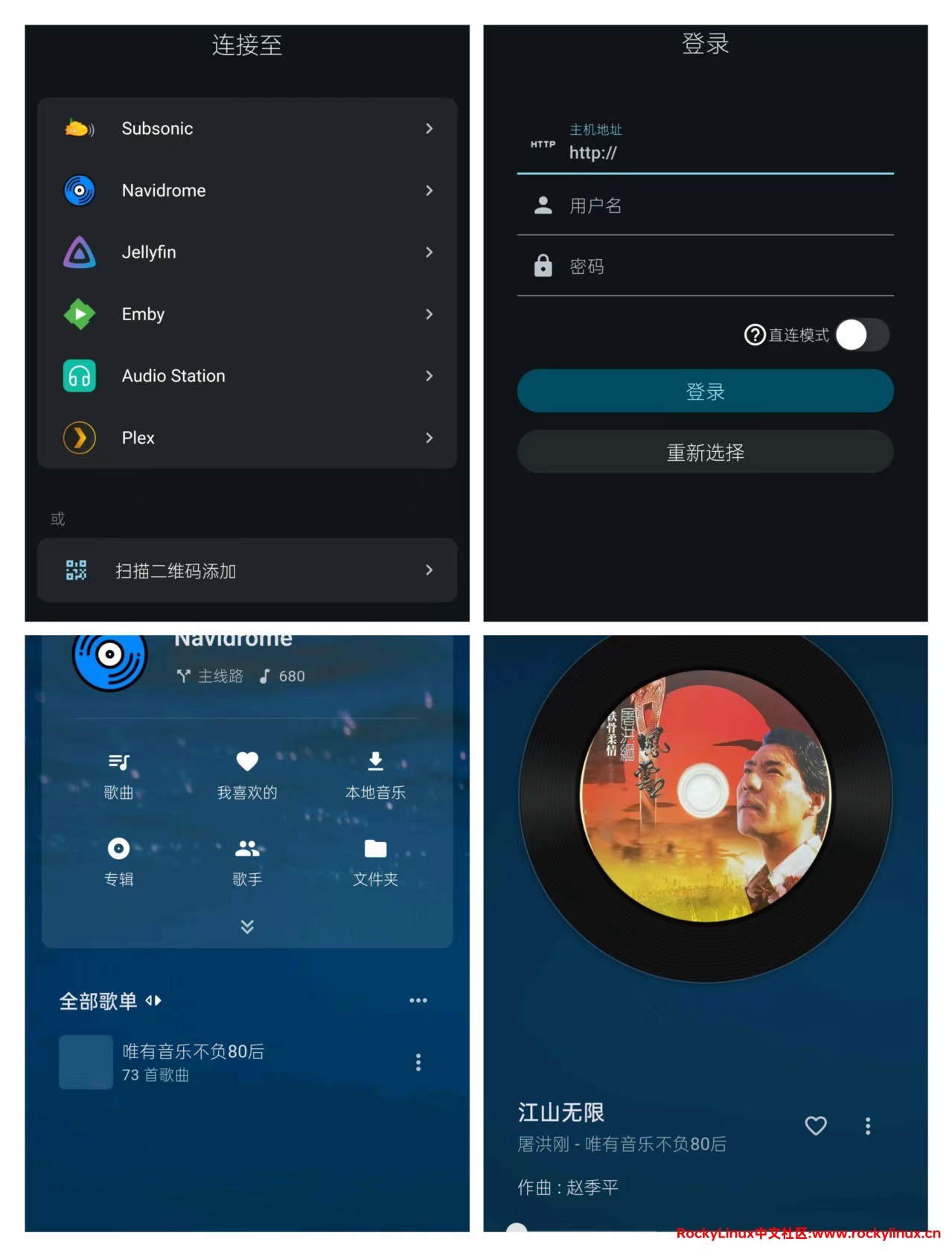 前文提到,Navidrome 支持所有 Subsonic 客户端。下载相应的客户端,使用 Navidrome 的 API 地址、账号、密码登录,就能访问和播放服务器上的音乐了。