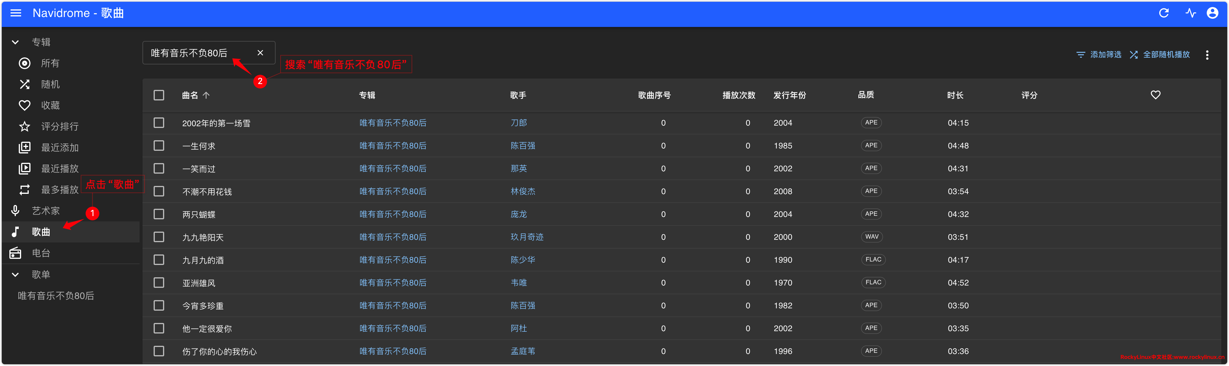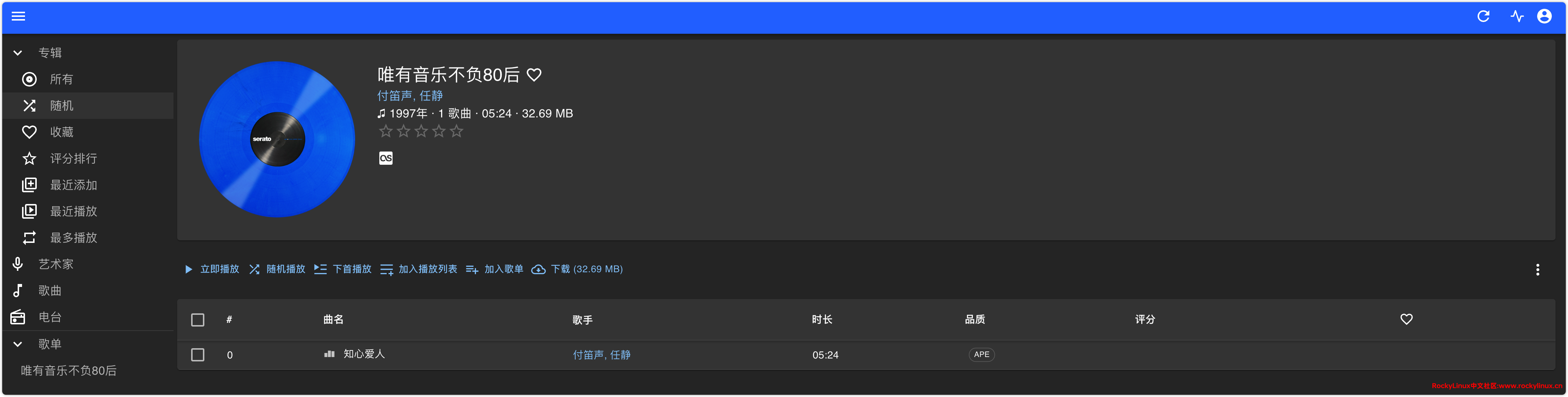 比如:木子这里点击专辑歌手 “付笛声,任静” 的 “唯有音乐不负 80 后” ,进去后对应列表就只有他们唱的一首 “知心爱人”(当然如果这个专辑中有多首他们的歌曲,都会显示出来)。