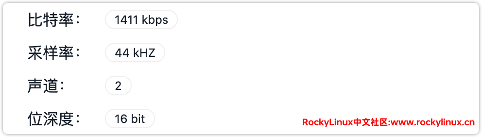 一个采样率为 44.1 kHZ,采样大小为 16 bit,双声道的 PCM 编码的 WAV 文件,比特率 = 44.1K x 16 × 2 = 1411.2 Kbps。如下图所示:
