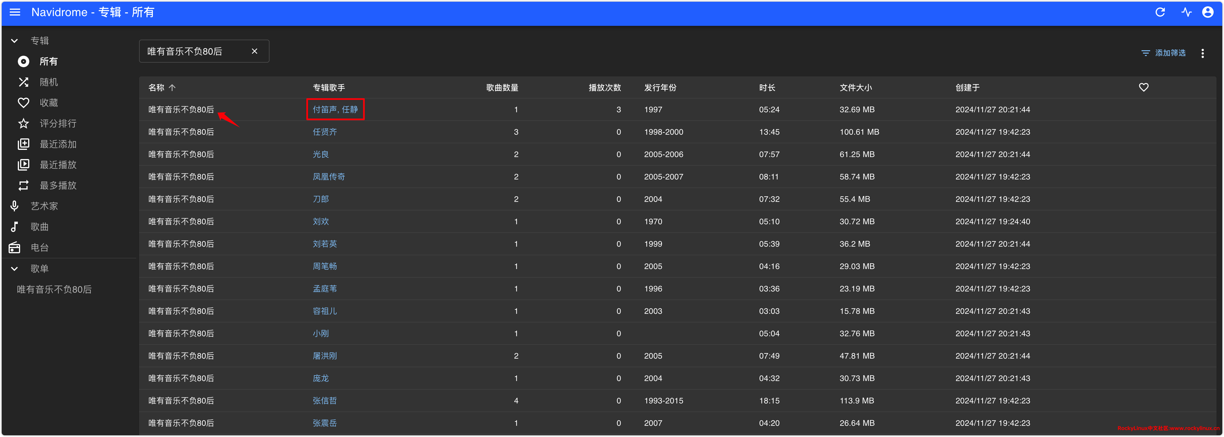 但是 Navidrome 的音乐分类,并不是按照专辑来的,比如一个专辑中有多个不同的歌手,就像群星 CD,这种里面不止一个歌手,它就会将对应的专辑拆解成多个人的,点击某一个“名称”时,只会进入对应某一个歌手的对应专辑列表。