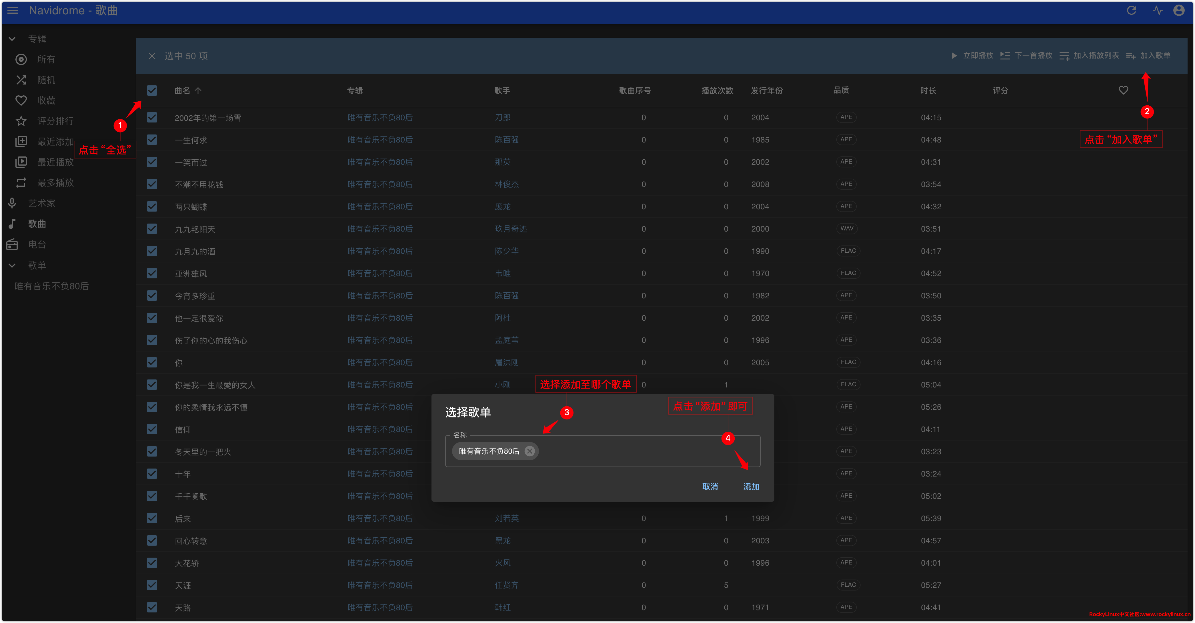 右下角选择一页显示的歌曲数量,最多为 50 首,如果您的专辑歌曲超过 50 首,可以需要添加几次,在右下角进行翻页。具体操作如下图所示: