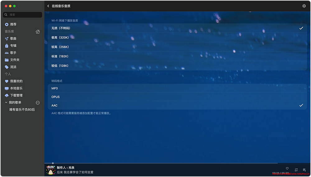 WiFi 情况下优先无损音质,转码格式采用 AAC,这里有明确说明 AAC 格式可能需要服务器端添加配置才能正常播放(具体配置参考下方说明)。