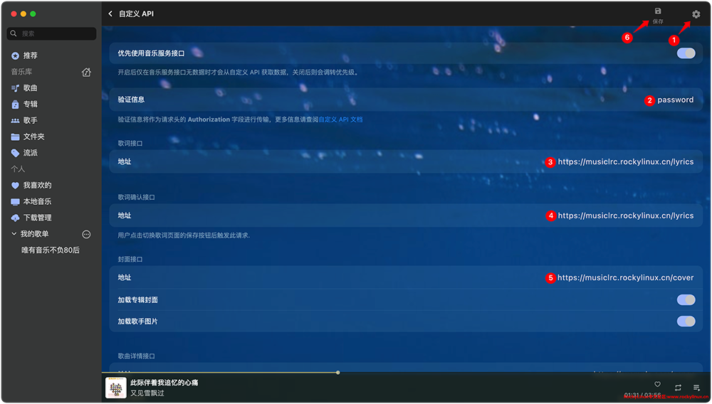 可以看到对应的 API 地址、封面 API 地址等,这个需要至音流播放器进行配置。