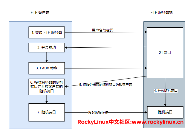 PASV命令的作用是通知服务器进入到被动模式- 随机端口指的是 1024 以上的端口