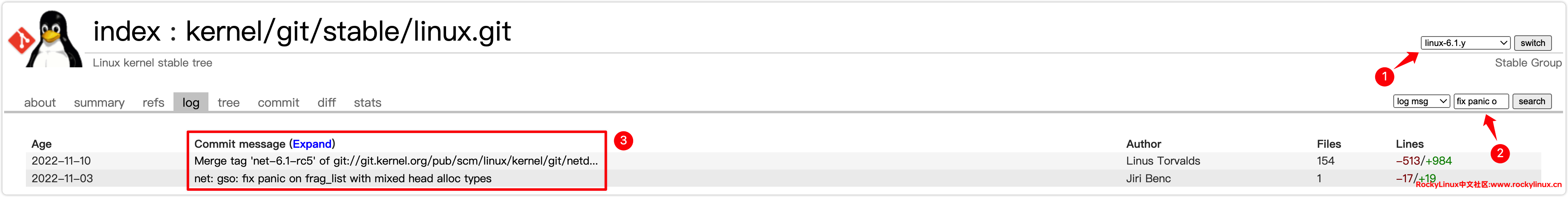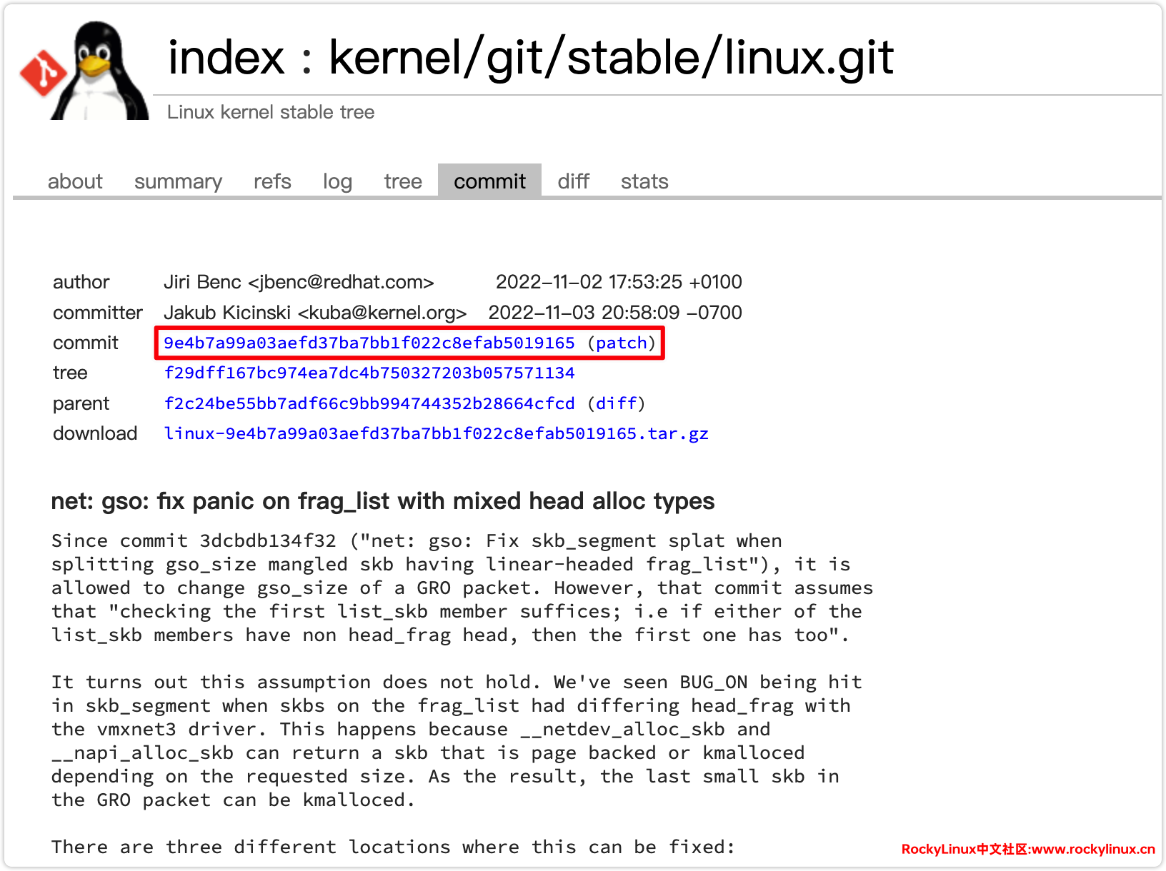 到这里只知道它在 v6.1-rc5 中已经提交了,这时候可以在 Linux 内核稳定版本和后续的修补版本仓库 kernel/git/stable/linux.git - Linux kernel stable tree 中搜索对应提交信息:fix panic on frag_list with mixed head alloc types,可以看到作者 Jiri Benc 在 2022-11-03 提交,并由 Linus Torvalds 于 2022-11-10 合并 Tag net-6.1-rc5 。