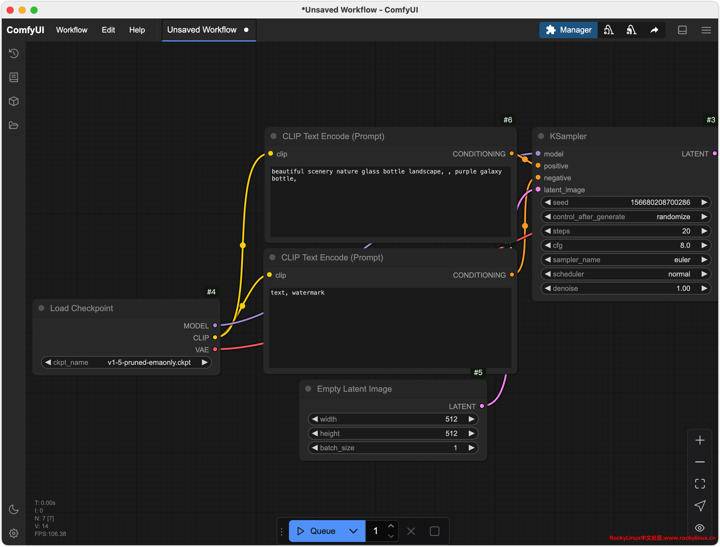 安装完成以后,默认就会有一个文生图工作流。对应模型存在,就可以正常运行。