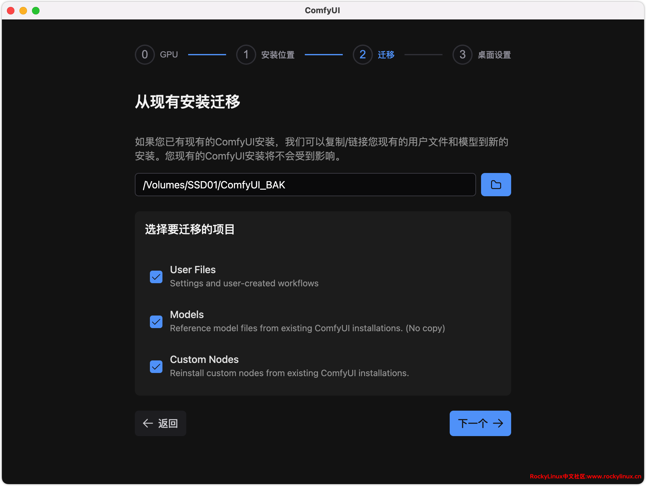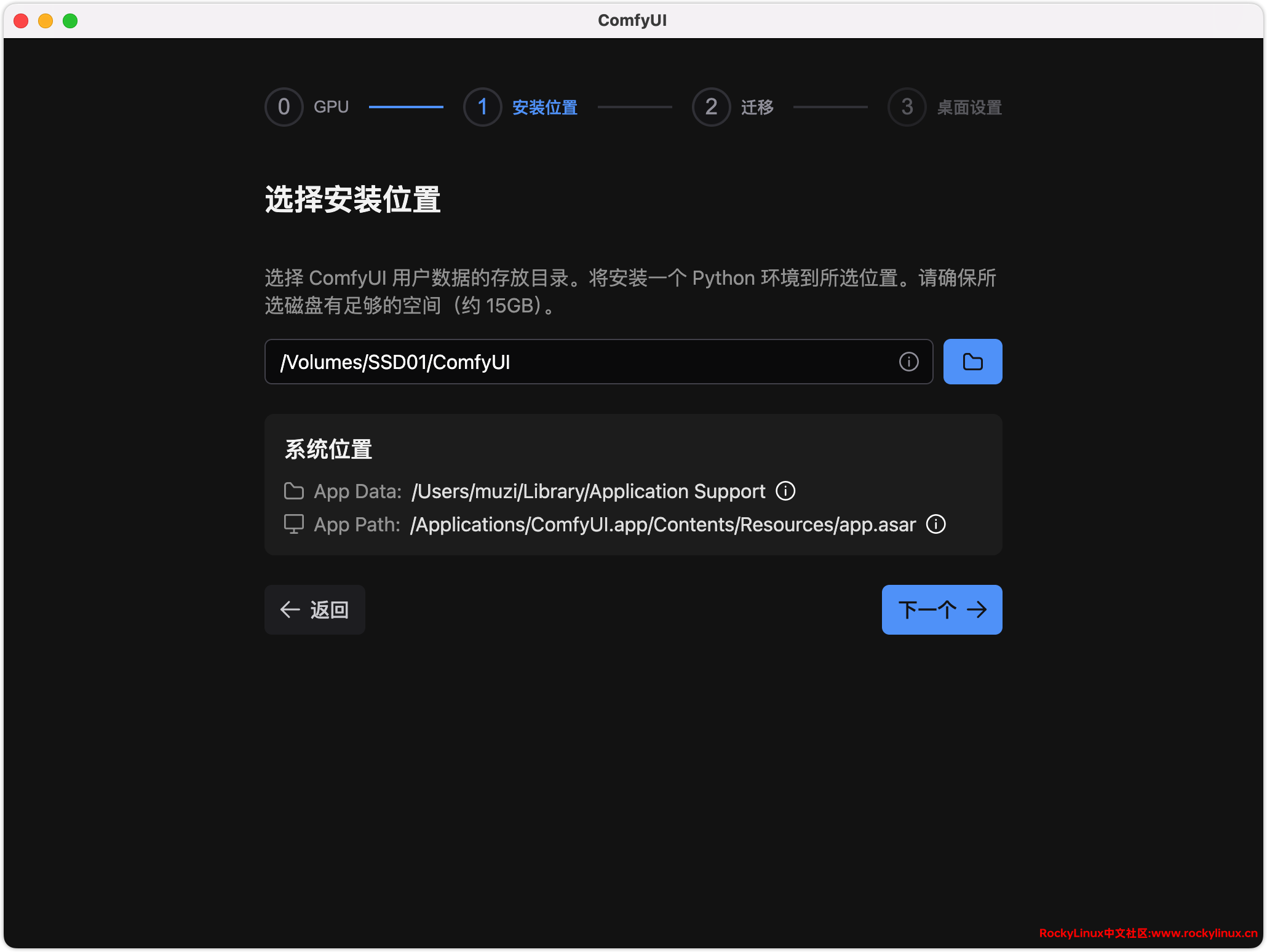 选择 ComfyUI 用户数据、Python venv 环境等安装位置,请确保所选磁盘有足够的剩余空间,大约 15GB 左右,但因为后期大模型等都是放在这个目录下管理,所以建议根据实际使用模型大小选择安装位置。