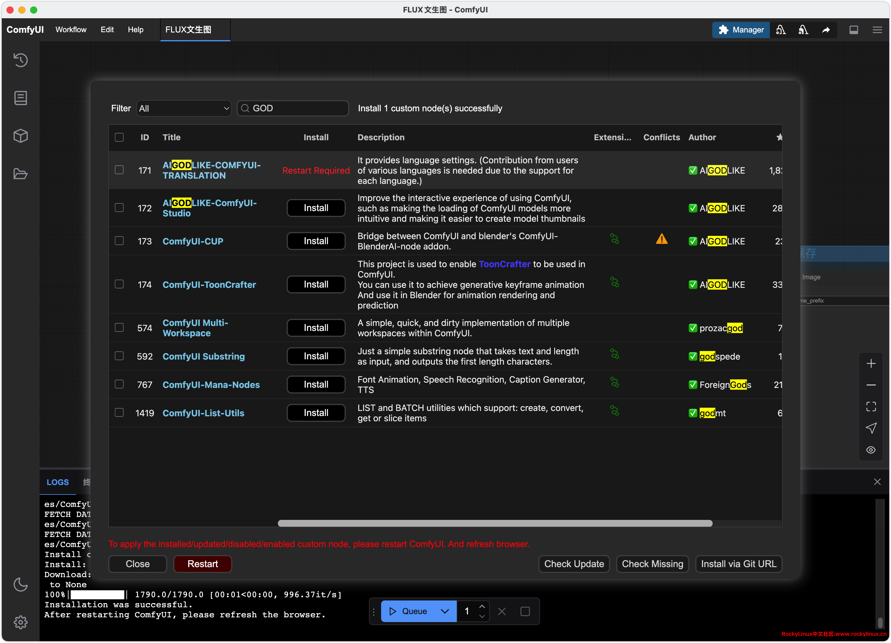 ComfyUI 桌面版默认已经安装 ComfyUI-Manager 节点管理器,所以可以直接在节点管理器中搜索 AIGODLIKE-COMFYUI-TRANSLATION,点击 “Install”,进行安装。