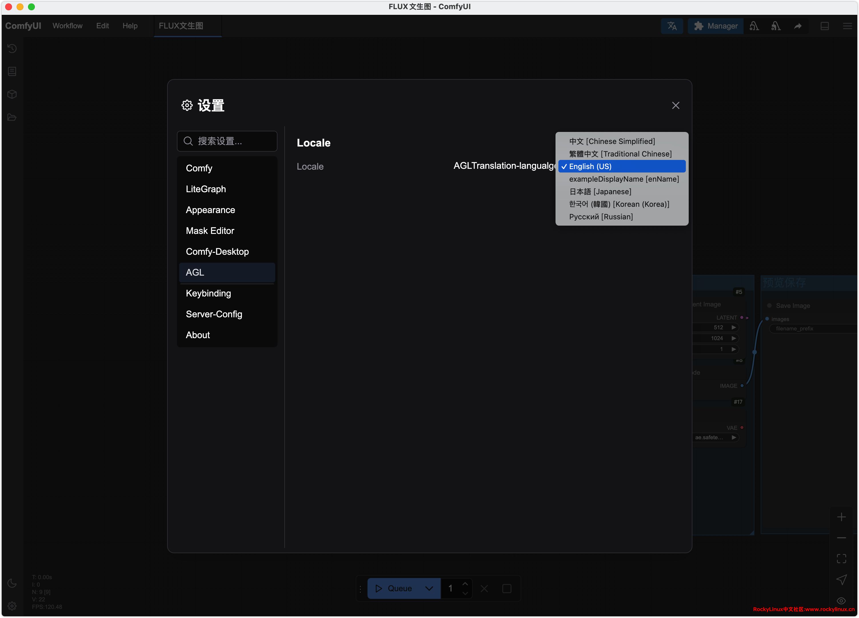 点击左下角的“设置”图标 -- AGL -- 选择“中文 [Chinese Simplified] ”,会自动重新加载界面。