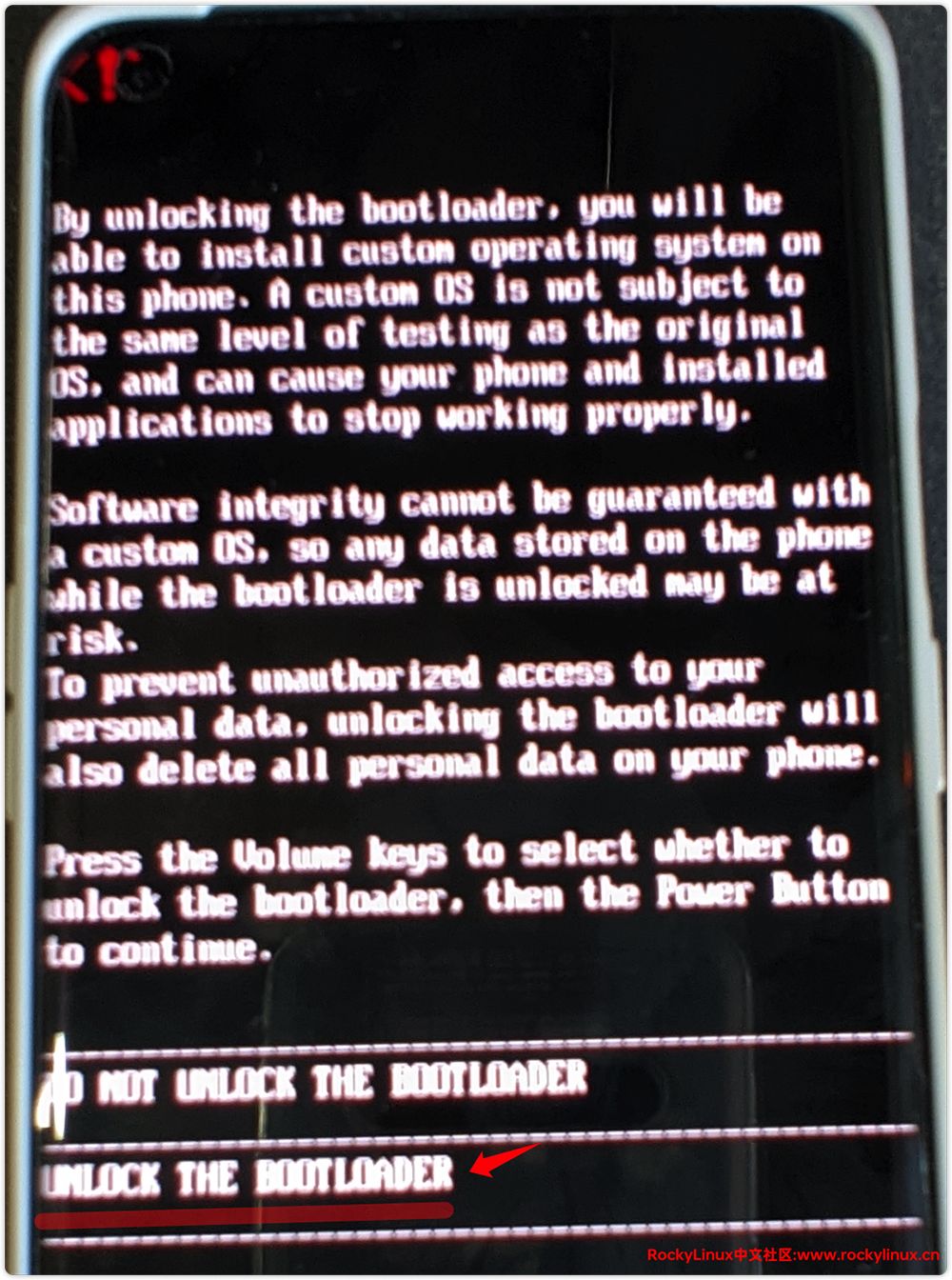 输入 fastboot flashing unlock,手机开始重启,会进入如下界面,选择 “UNLOCK THE BOOTLOADER”,解锁 BL 。音量上下键选择,电源键确认(请无视屏幕指纹与反光😂😂😂)。