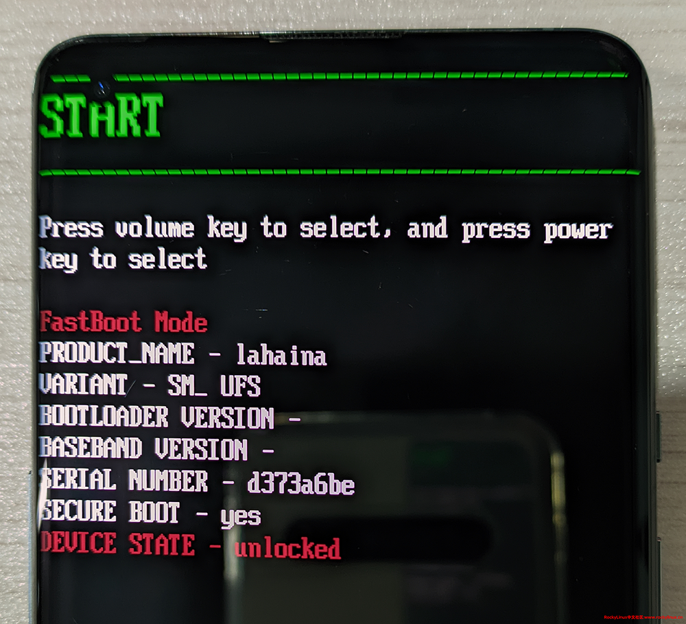 先将手机关机,然后同时按音量下键+电源键,进入 fastboot 模式。