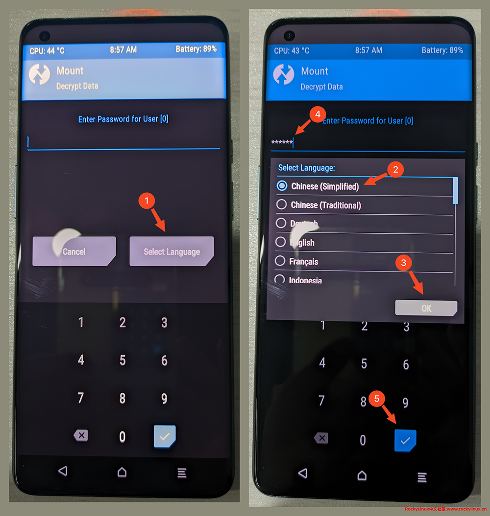 手机将进入以下界面,下面是三个屏幕截图,如图所示选择语言、输入密码,点击勾选✅即可。