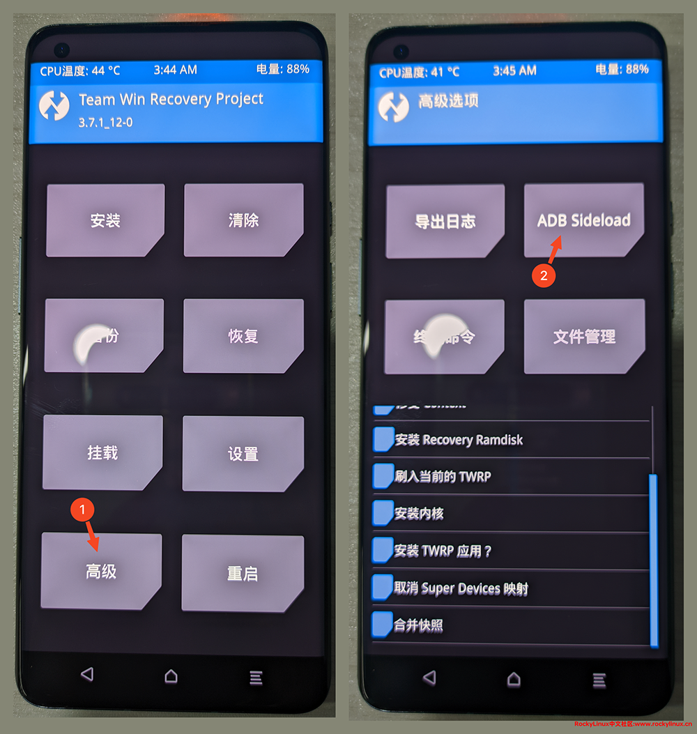 进入 TWRP 后,如下图所示,点击“高级”--“ADB Sideload”。