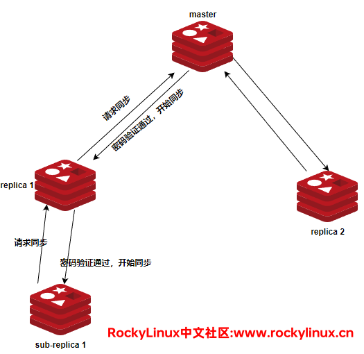 除了可以将所有的 replica 连接到一个 master 之外,replica 与 replica 之间也是可以采用一种叫做级联式的结构进行连接,此时所有的 sub-replica 将接受与 replica 相同的数据流