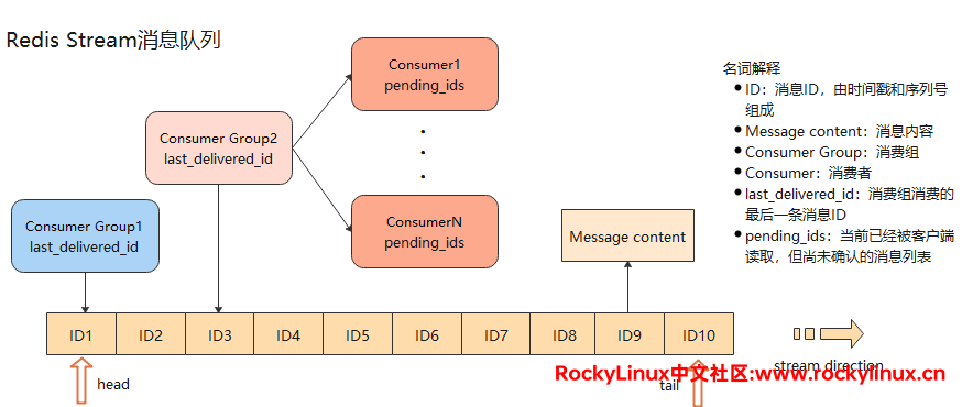 stream 是一个消息链表,每个消息都有唯一的 ID 号和对应内容,将所有的消息串接起来,就有如下图所示的结构,主要由四部分组成: