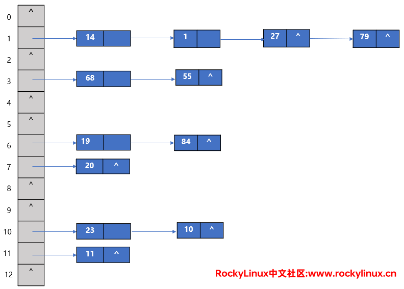 比如有这样的一组数据——{19,14,23,1,68,20,84,27,55,11,10,79},假如我们的散列函数是取模的(取余数),即 hash(key)=key mod 13。这里面的元素 14、1、27、79的余数都是 1 ;68、55余数都是 3 ;19、84余数都是 6 ;23、10余数都是 10。于是就有如下图的结构(左边的0、1、2是下标,可以有13种可能):