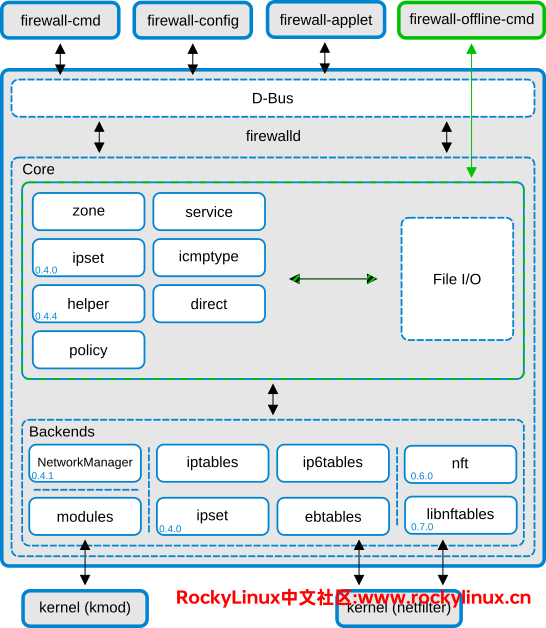 尽管 firewalld 在某些方面提供了更现代化的特性和更好的用户体验,但有些高级用户可能仍然偏爱 iptables,由于其直接性和精细控制的能力。在某些情况下,firewalld 和 iptables 也可以同时使用,但一般建议使用一个命令来进行配置,从而避免配置上的混淆。在 Rocky Linux 9.3 系统上,firewalld 默认使用 nftables 作为其后端。