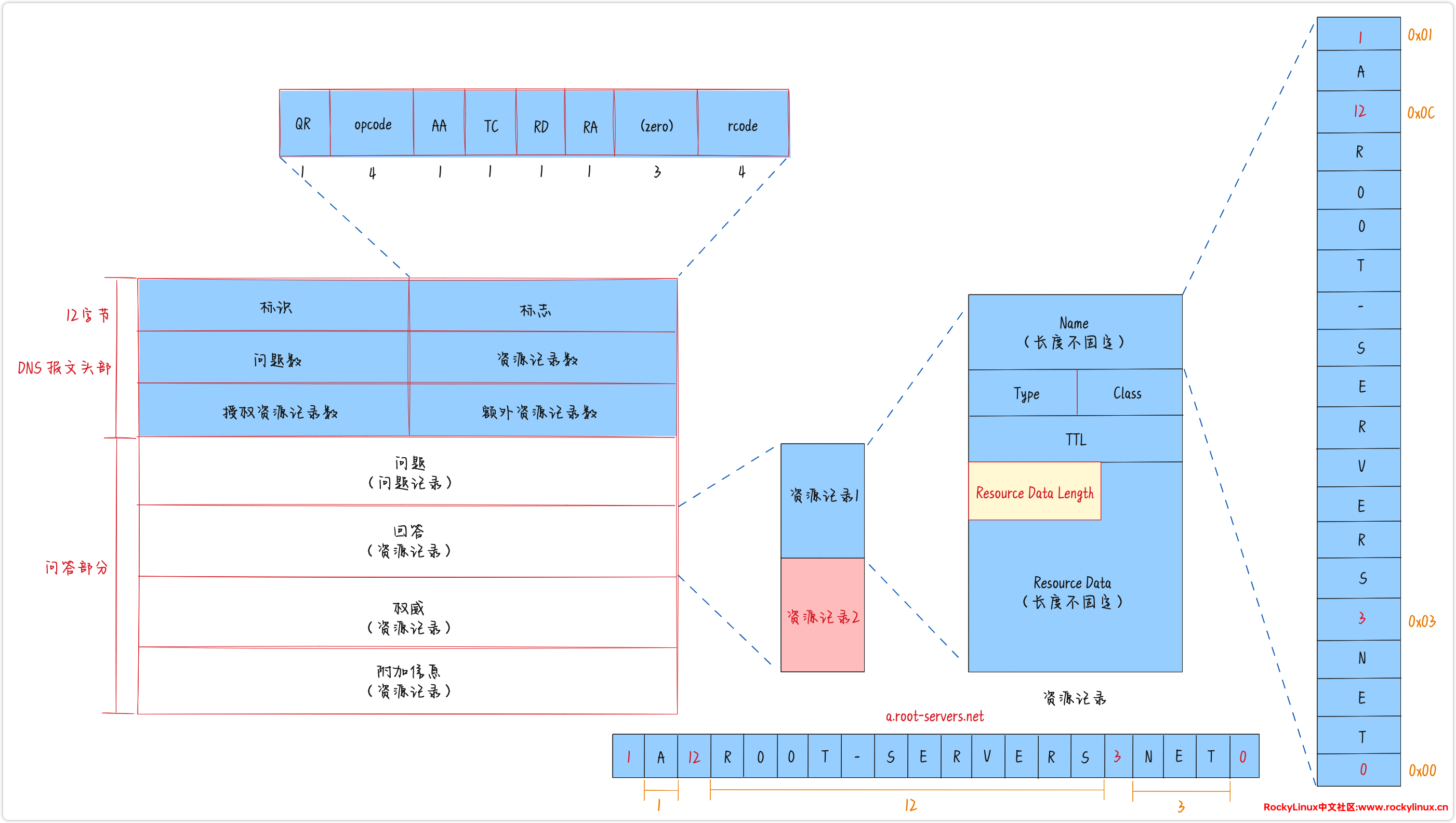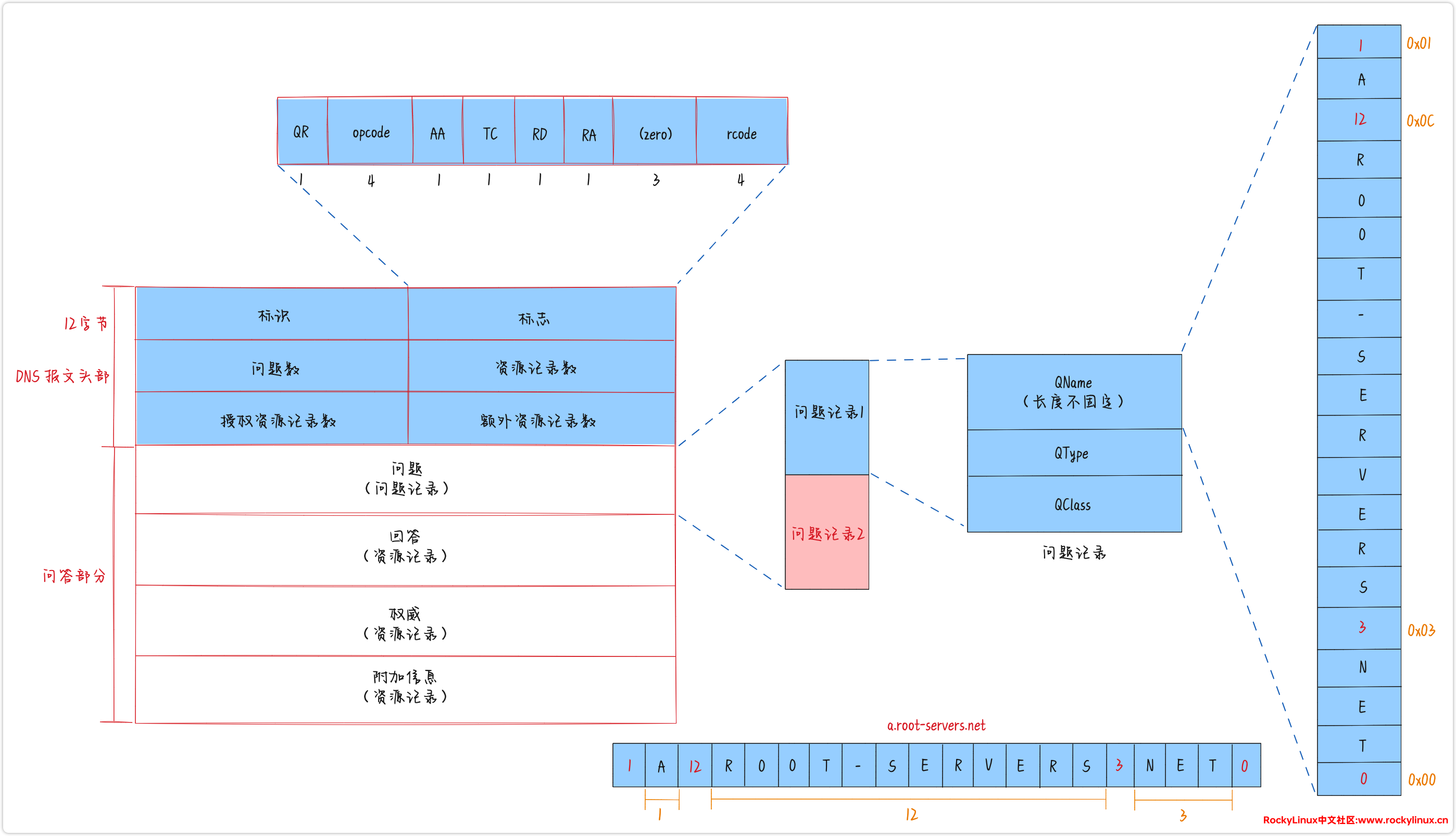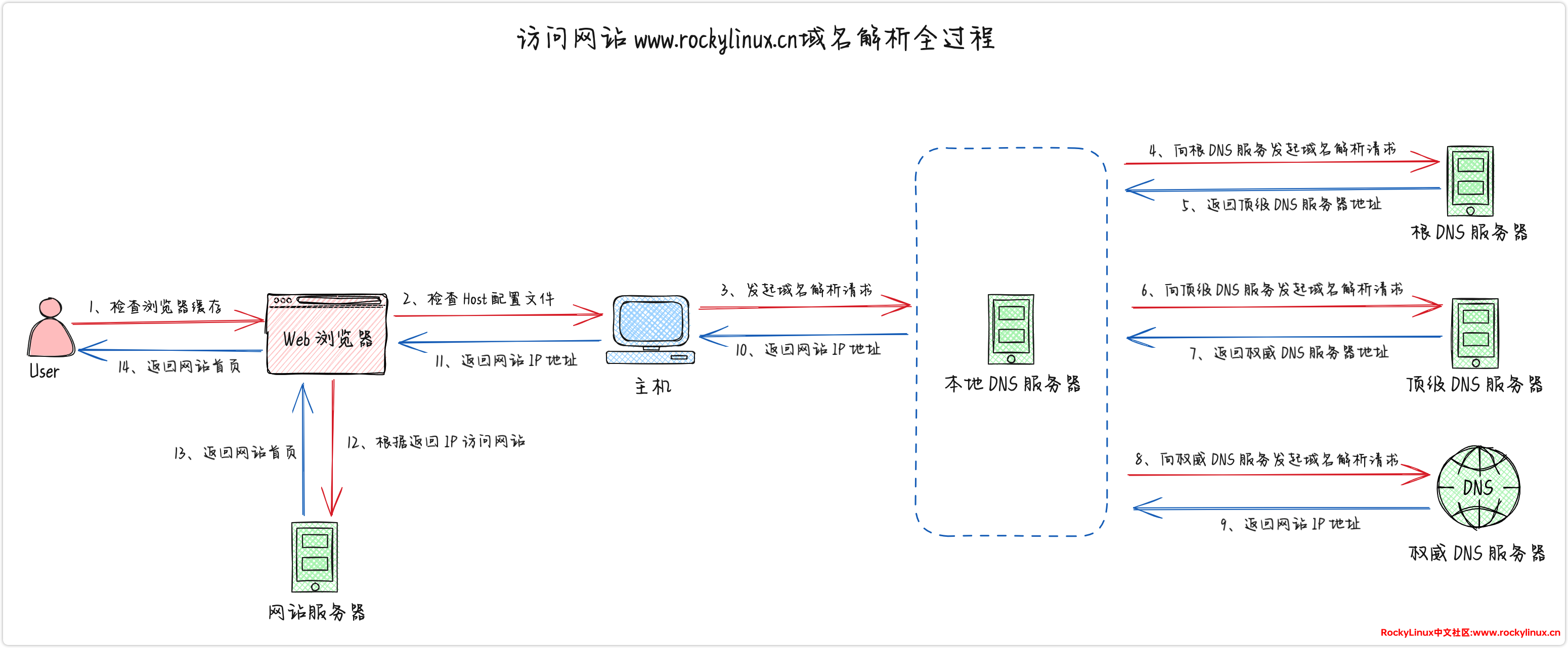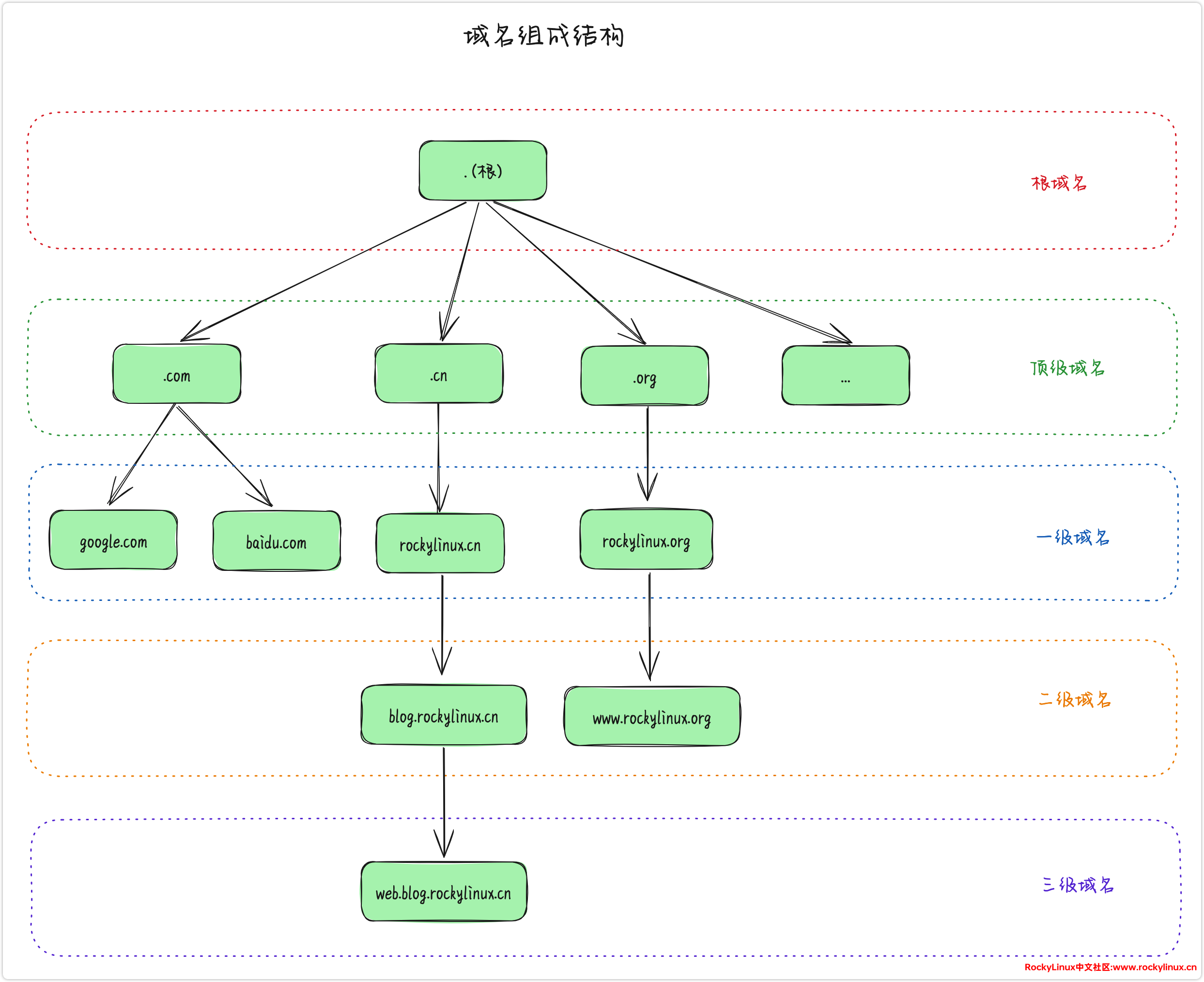 DNS(Domain Name System,域名系统)是互联网的重要组成部分,是用于实现域名和 IP 地址相互映射的一个分布式数据库,它将人类易读的域名(如: www.rockylinux.cn )翻译成计算机能够识别的 IP 地址(如:192.168.1.1),使用户可以更快速便捷地访问互联。互联网连通的是全球资源,单一的域名服务器不足以支撑全部的地址转换操作,因此全球有多套域名服务器相互配合使用。早在 1983 年互联网就开始采用层次树状结构的命名方法,并使用分布式的域名系统进行解析操作。这样既提升了域名解析的效率,同时也保障了域名解析的稳定性,如果系统中单个域名服务器出现故障,不会对整个 DNS 系统的正常运行造成太大影响。