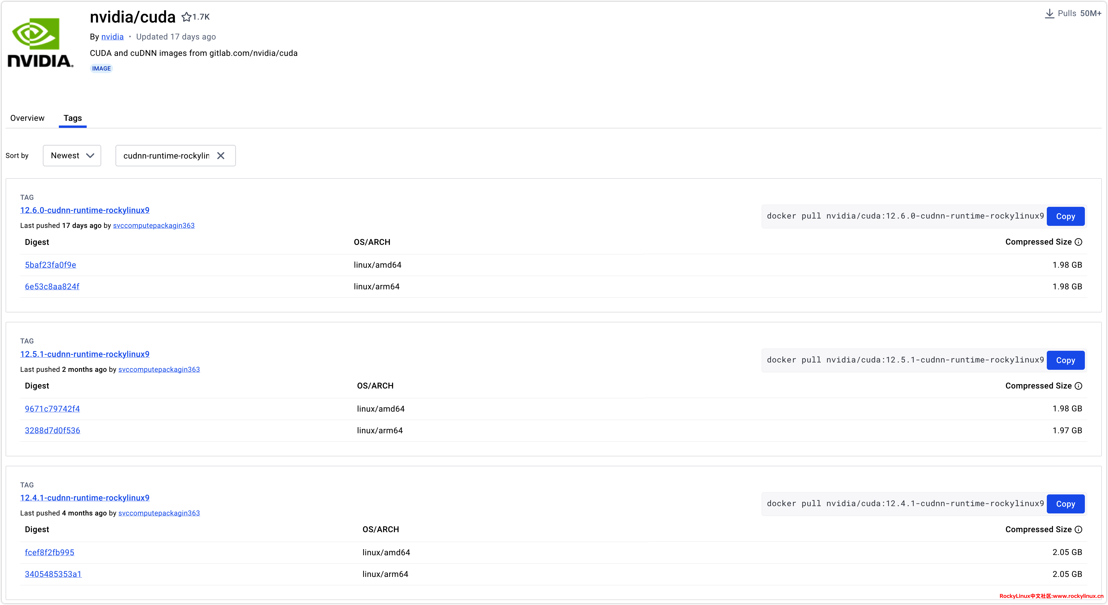如果想使用 Rocky Linux 9 cuDNN Docker 镜像,可以从这里下载:nvidia/cuda Tags | Docker Hub,但注意考虑兼容性问题。比如:这里安装的显卡驱动是 550.107.02,其对应兼容的 CUDA Toolkit 包是:CUDA 12.4 Update 1,所以 cuDNN Docker 镜像也需要下载 nvidia/cuda:12.4.1-cudnn-runtime-rockylinux9。