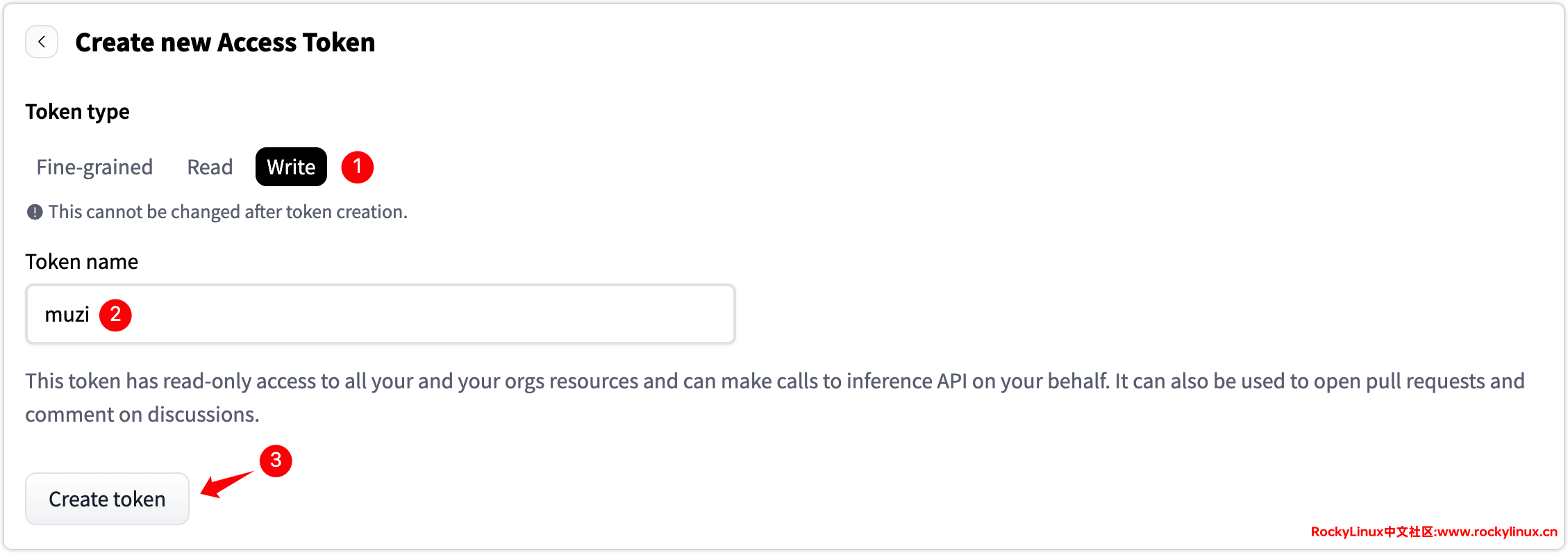 Token 的类型有三种:Fine-grained(更细颗粒度权限设置)、Read、Write,木子这里直接创建 Write 权限账号(Write 权限可读写),设置 Token 名称,点击“Create token”。