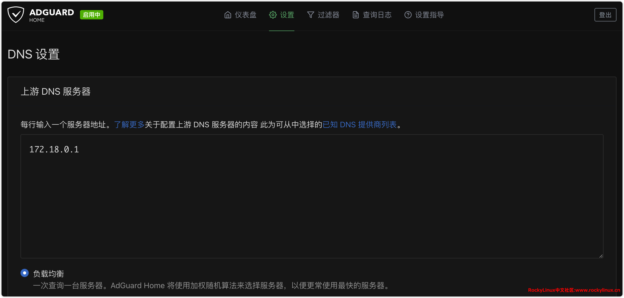 在 ADGuardHome 配置上游 DNS 服务器为 SmartDNS 服务 IP:172.18.0.1。