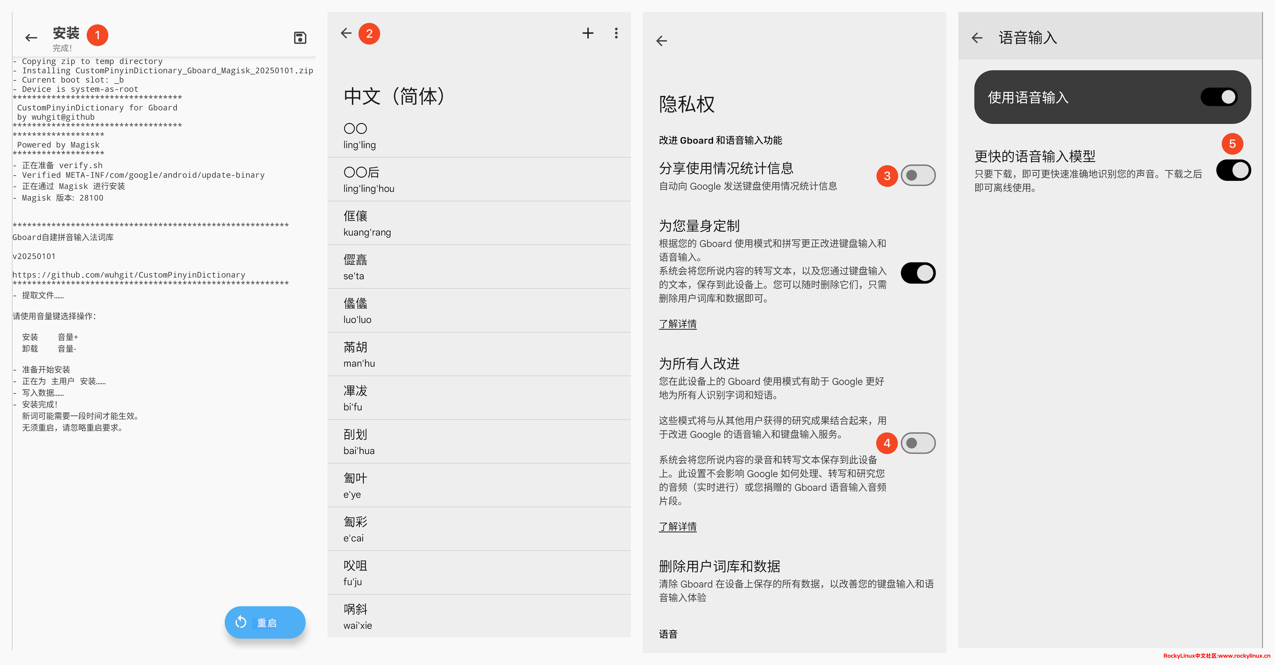 在 Magisk 导入模块时,需要按音量+键进行安装,安装完成以后不需要重启手机,等待一会在 Gboard 设置 -- 字典 -- 个人字典 -- 中文(简体) 就可以查看到本词库导入后的数据。如果有更新,直接在 Magisk 模块管理里面更新对应词库即可。